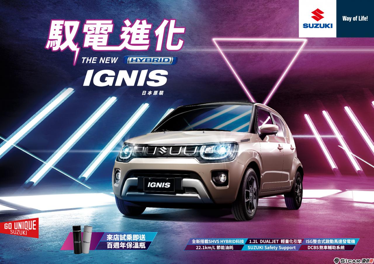 SUZUKI新世代戰略小車IGNIS,結合掀背車功能與SUV車型的高頂設計,搭配靈活多變的座艙配置,2017年上市即獲得世界年度都會車TOP 3殊榮,更連續兩年獲得台灣車訊風雲獎「最佳進口都會車」的肯定。THE NEW IGNIS以SUZUKI首部SHVS(Smart Hybrid Vehicle by SUZUKI)智能混合動力車之姿,再次撼動台灣車壇!全新搭載HYBRID輕油電科技、DCBS煞車輔助系統,以及1.2L DUALJET輕量化引擎,以1,197cc最小級距排氣量,造就THE NEW IGNIS兼具稅金與燃油的雙效節能表現,創造全面進化的駕馭體驗。同時,為了讓更多台灣消費者親身感受「GO UNIQUE」的品牌精神,TAIWAN SUZUKI自即日起推出全車系舊換新購車優惠,配合政府補助最低63萬元起即刻入主THE NEW IGNIS。馭見進化,馭見生活無限可能。