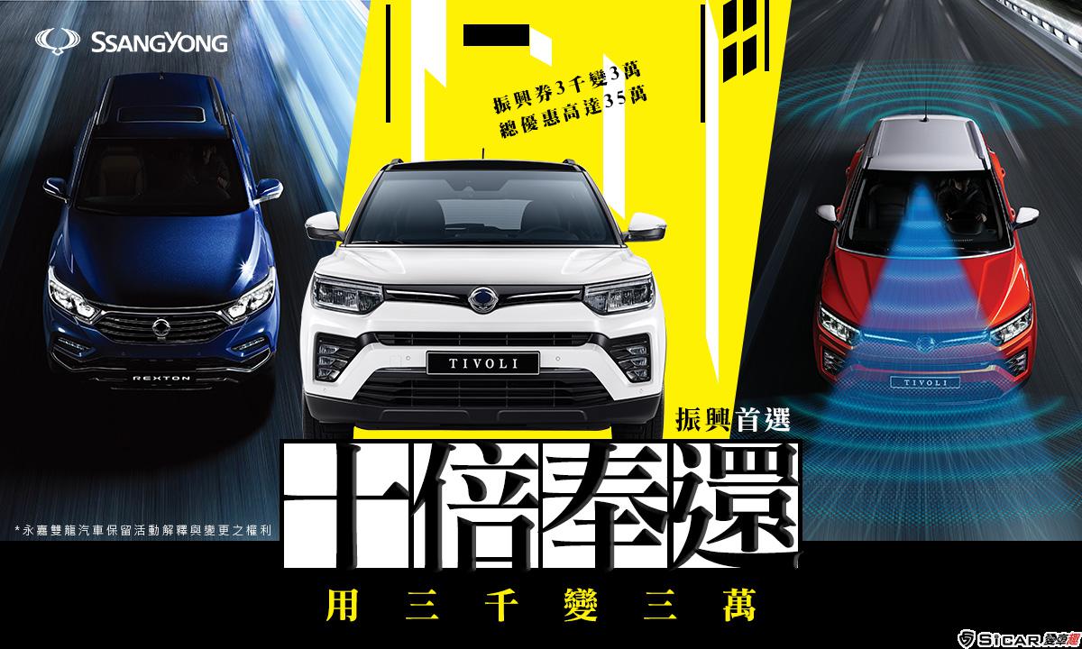 為響應政府振興三倍券政策,SsangYong總代理永嘉雙龍汽車推出「振興入主十倍奉還」活動,活動期間內(7/1-7/31)持振興券3000元入主SsangYong雙龍汽車任一車款,即贈3萬元專屬配件金;再享「不限里程、不限次數免費拖吊服務」,還有5年10萬公里原廠保固。活動期間來店賞車試乘即贈品牌好禮SsangYong行李收納袋,入主指定車款還可額外獲得5萬元購車金。