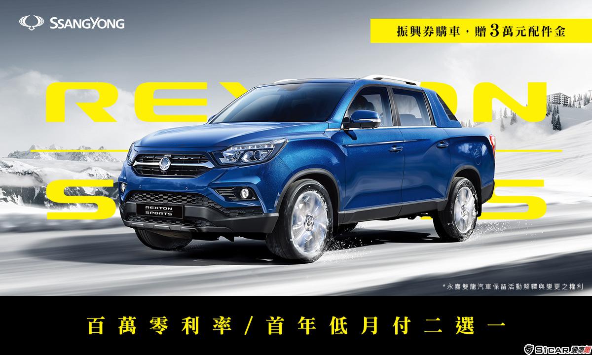 本月入主豪華越野皮卡《REXTON SPORTS》享100萬0利率、首年低月付購車優惠二選一、振興券購車再送3萬配件金