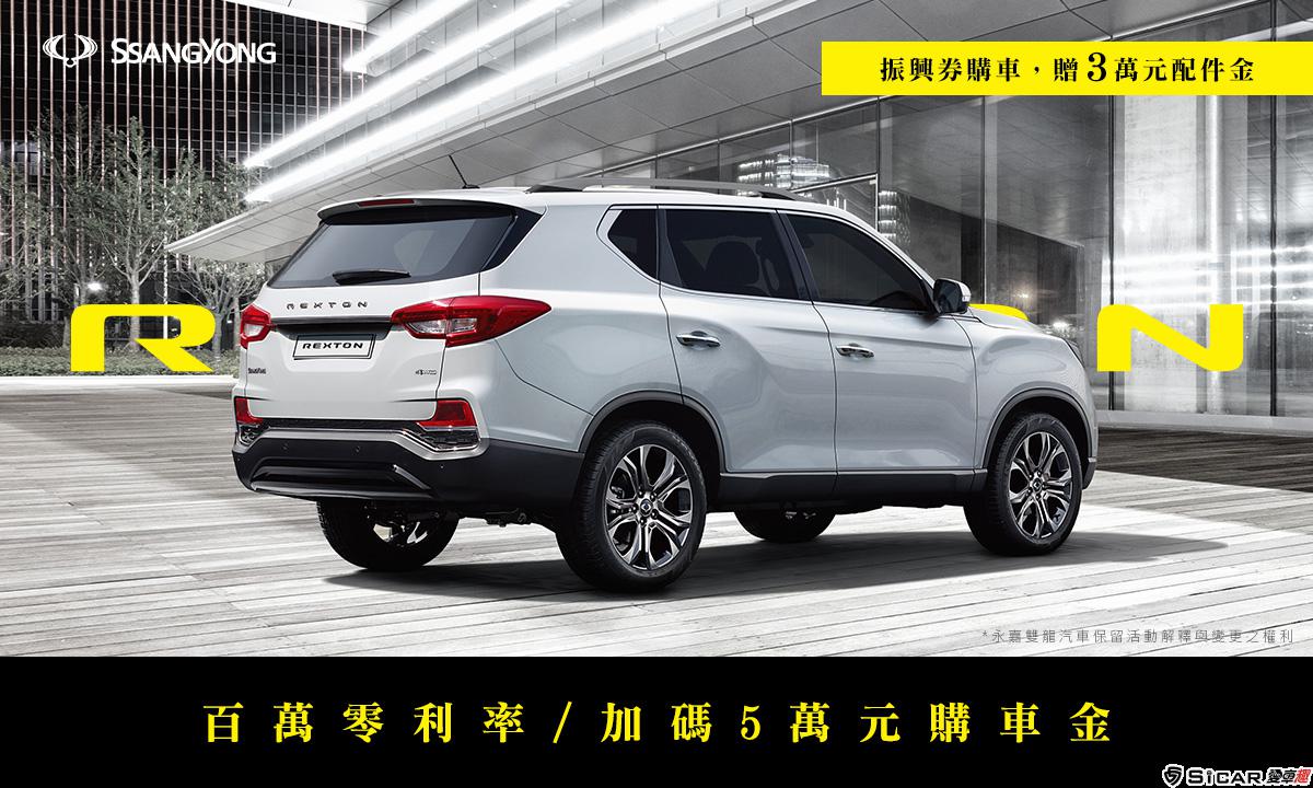 振興券購入越野旗艦休旅《REXTON》送3萬配件金,再加碼5萬購車金! 最高享100萬0利率,再送當年度領牌規費、強制險