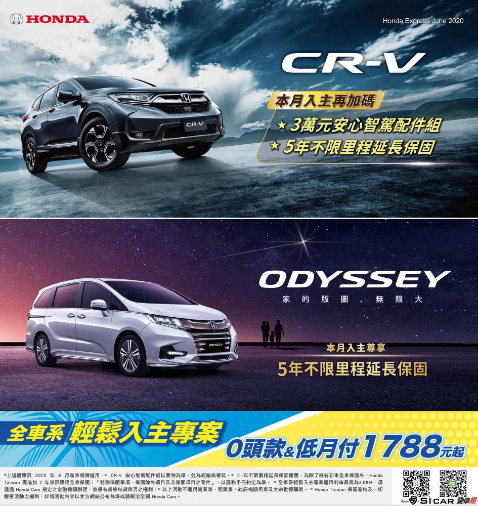 本月入主Honda CR-V,限時贈送近10萬價值禮遇,除贈送tokuyo按摩椅外,更加碼贈送「5年不限里程延長保固」及「3萬元安心智駕配件組」, 贈送配件品項包含 上鎖警示與遙控收鏡組、前後雙鏡頭行車記錄器、LED後廂照明燈、前後偵測雷及PM2.5負離子清淨系統。 此外,限時入主Honda HR-V除贈送tokuyo按摩椅外,更加碼贈送「5年不限里程延長保固」;限時入主Honda ODYSSEY亦加碼贈送「5年不限里程延長保固」。 Honda Taiwan亦特別規劃「輕鬆入主專案」優惠,本月底前入主Honda全車系,即可獲得購車免頭款、超低月付「0頭款 & 低月付1,788元起」之 最佳獻禮,敬請 廣大消費者把握本月最佳購車良機。