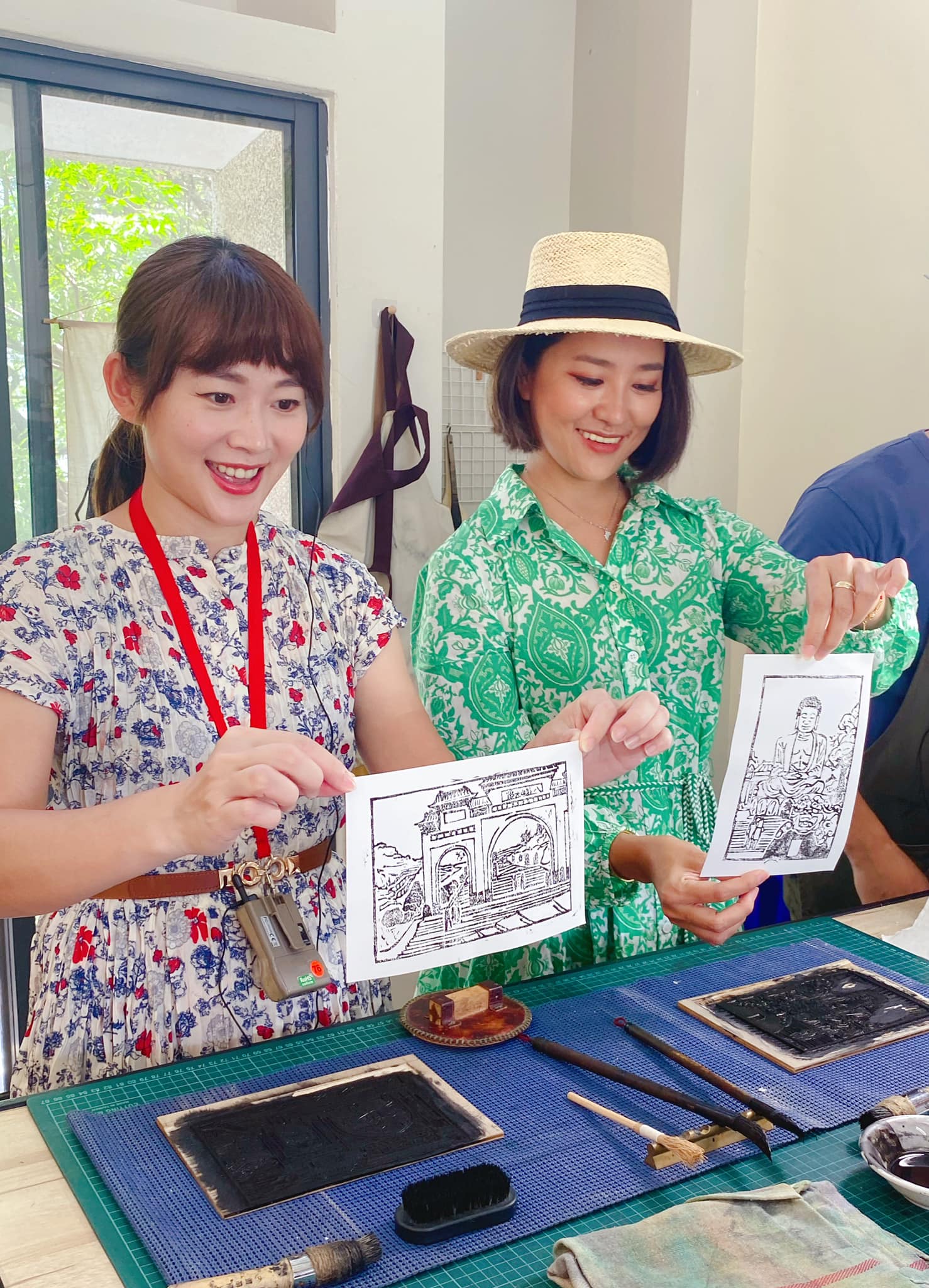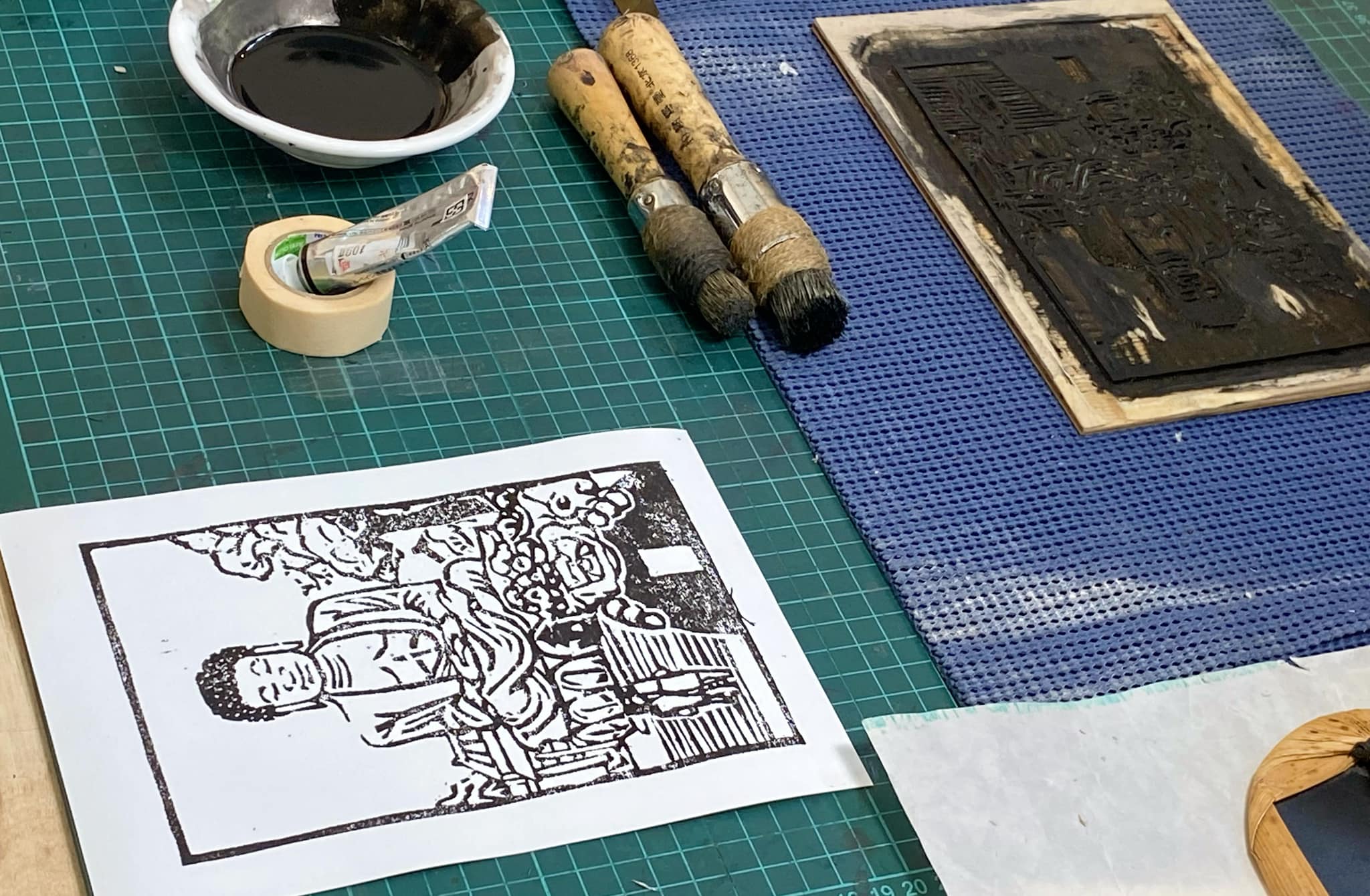 另一項體驗是版畫拓印,走進「踏印版圖」工作室,迎接我們的也是一位彰化青年,來自芬園的林達佑,他將八卦山的景觀、彰化市知名景點與建築作為創作主軸,彰化大佛、牌樓、灰面鷲、扇形車庫⋯等在地印象變成了版畫或圖章的主角,細膩地刻畫出彰化市過去與現在的生活脈絡。