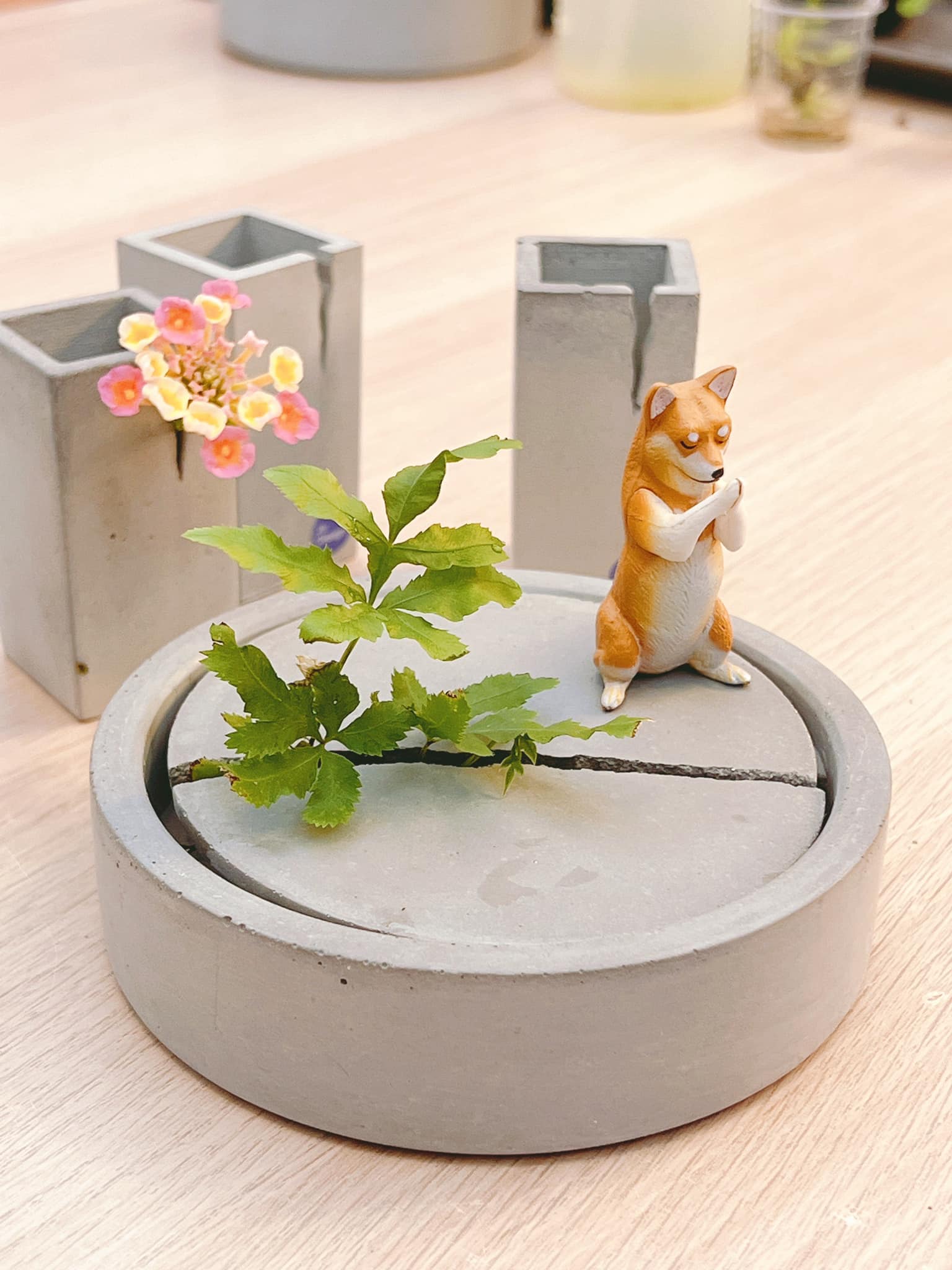 卦山村美學生活聚落的村長許晉榮帶著我們導覽,他在二樓空間也有一間工作室「解憂設計」,小時候在花店長大的他,從住家路邊的小花小草獲得靈感,以3D列印技術創作多款別具巧思的水泥花器,並設計趣味的植栽活動(學習小花小草從夾縫中求生存,充滿生活哲學的療癒體驗),只要不到10分鐘,就能將自己的美學創意帶回家。