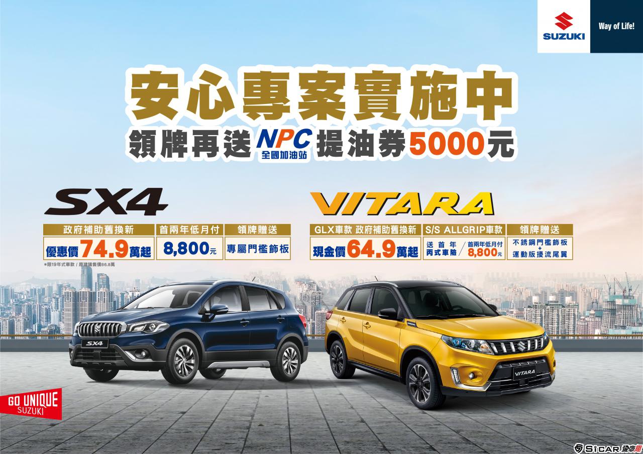 TAIWAN SUZUKI提供多種優惠車款,持續給您與家人安心移動的好選擇。即日起至4月底,歐洲原裝SX4舊換新優惠價74.9萬起,本月底前領牌的車主即可擁有「SX4 專屬迎賓門檻飾板」。全能休旅VITARA GLX車款舊換新優惠價64.9萬起,另外S及S ALLGRIP車款贈送首年丙式車險,VITARA全車系本月底前領牌的車主加贈「運動風擾流尾翼」及「VITARA 專屬迎賓門檻飾板」專屬好禮。VITARA及SX4兩車系皆享有首兩年低月付8,800元,本月底前領牌再加贈送NPC全國加油站提油劵5,000元,即刻入主SUZUKI安心專案,安心駕馭,輕鬆享樂。