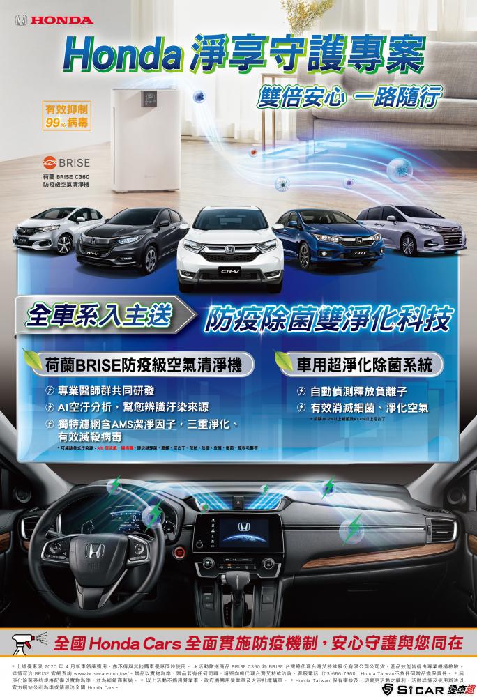 新型冠狀病毒導致全球恐慌,使汽車、醫療、保健、抗菌等 商品成為現今最熱銷的防疫品項,Honda Taiwan為了守護大家的健康,即日起至4月底止,於全國Honda Cars限時推出「Honda 淨享守護專案」,為大家的防疫生活提升雙倍安心的保障,凡於活動期間入主Honda全車系,即贈送由專業醫師群共同研發、AI空污分析汙染來源,以獨特濾網三重淨化、消滅病毒的「荷蘭BRISE防疫級空氣清淨機」及採特殊負離子場域設計、可使負離子有效擴散,快速淨化車室空氣品質的「Honda車用超淨化除菌系統」等防疫除菌雙淨化科技好禮。
