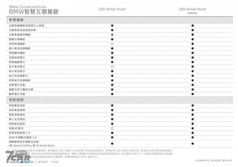 2-Series Active Tourer 車系依然維持 220i 及 220i Luxury 兩種車型編成,但針對最入門的 220i 等級將原先需要加價選配的主動車道維持輔助列為標準配備,建議售價則依然維持在新臺幣 172 萬元起。