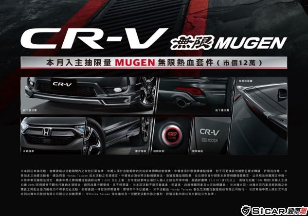 即日起開放限量搶購「Honda CR-V」無限MUGEN套件,自11月起至12月底入主Honda CR-V即可享入主免費抽限量MUGEN無限熱血套件。而針對新車車主Honda Taiwan也提供優惠方案,直接購買無限MUGEN熱血套件享有市價的5折優惠(6萬),而本月入主更可享政府補助舊換新「貨物稅定額減徵新台幣5萬元」。