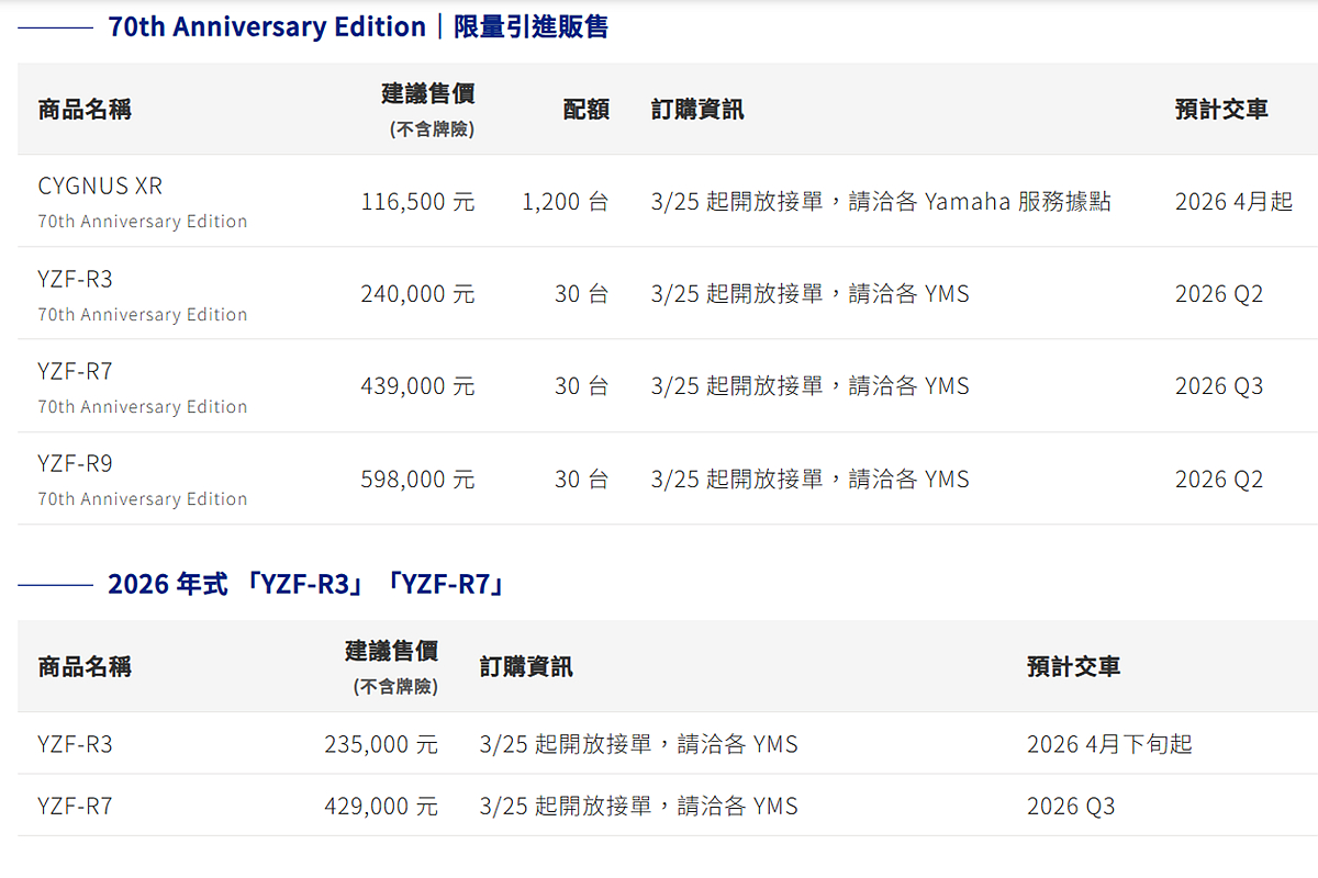 自 3 月 25 日起,各車系可依車型於對應通路據點洽詢:「CYGNUS XR 70th Anniversary Edition」請洽全台 Yamaha 服務據點;YZF-R Series「70th Anniversary Edition」版本以及 2026 年式「YZF-R3」、「YZF-R7」,請洽全台 YMS 重機旗艦店。