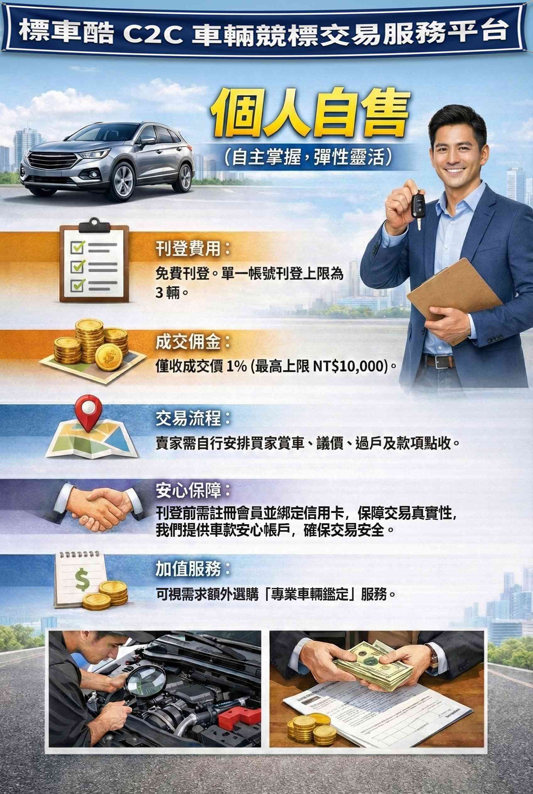沒有足夠時間等待自售流程,又對汽車買賣感到複雜難懂,SiCAR標車酷特別體恤會員推出「委託代售」服務。將由專人協助處理從物件刊登到過戶等所有繁瑣流程,並只會收取成交價5%最低新台幣3萬、上限6萬的服務費用。