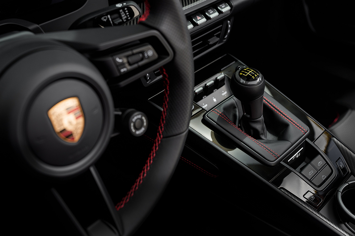 座艙標配黑色真皮內裝,一路延伸至遮陽板與 A 柱飾板。後艙隔板中央醒目點綴 GT3 S/C 專屬繡字。座椅中央椅面與方向盤皆比照 911 S/T,以打孔真皮包覆。承襲現行硬頂版 911 GT3 的純粹精神,911 GT3 S/C 捨棄按鍵啟動,保留位於方向盤左側的經典旋鈕式啟動開關。
