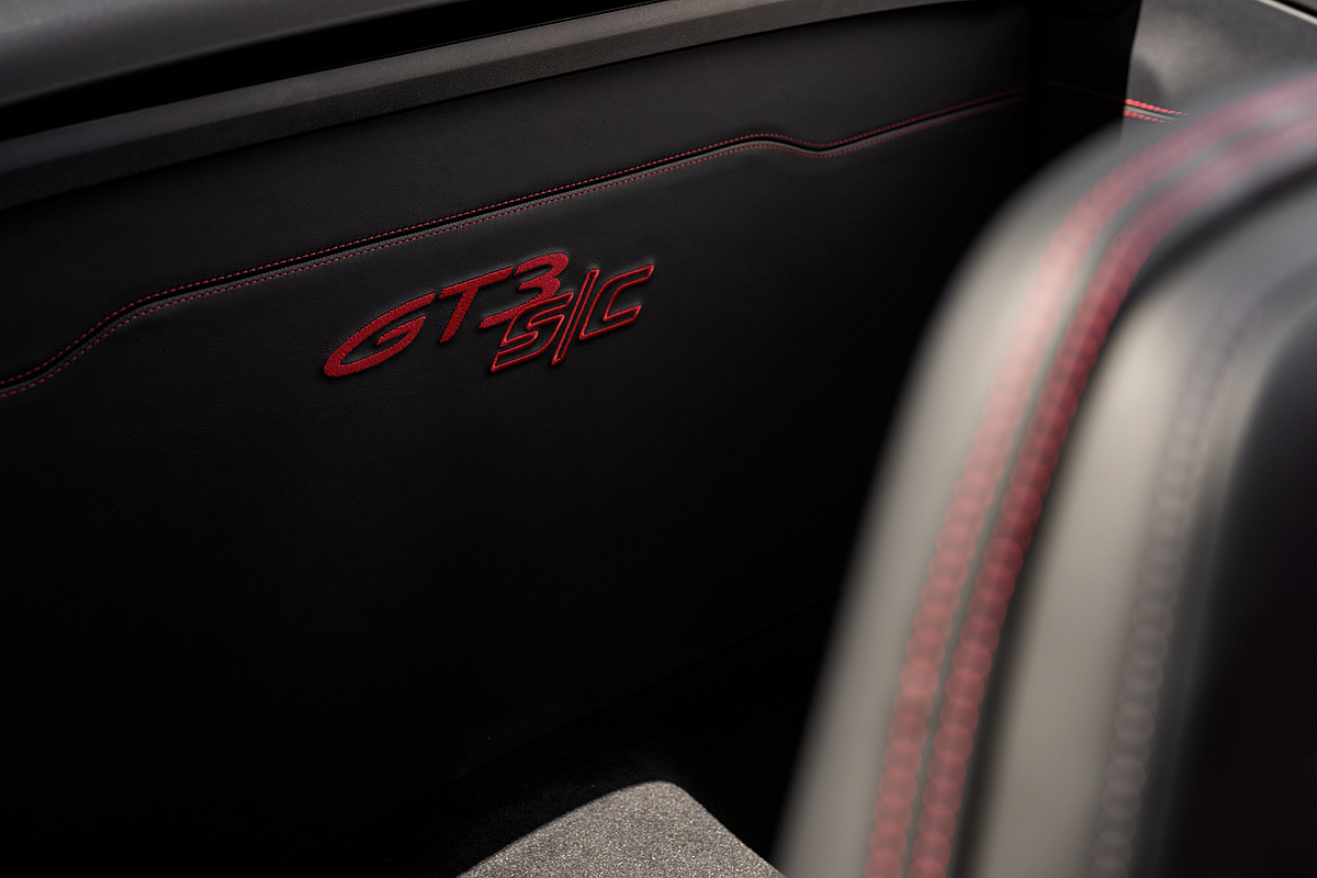 內裝採用輕量化地毯,搭配配置碳纖維車門拉環的輕量化車門飾板,深刻呼應 911 S/T 的經典設計語彙。911 GT3 S/C 採純雙座設定,標配四向電動調整跑車升級座椅(Sports Seats Plus)。車主亦可選配具備可收折椅背與碳纖維外殼的輕量化賽車桶型座椅。此座椅內建安全氣囊,具備電動高度與手動前後調整功能,並提供三段式座椅加熱選配。