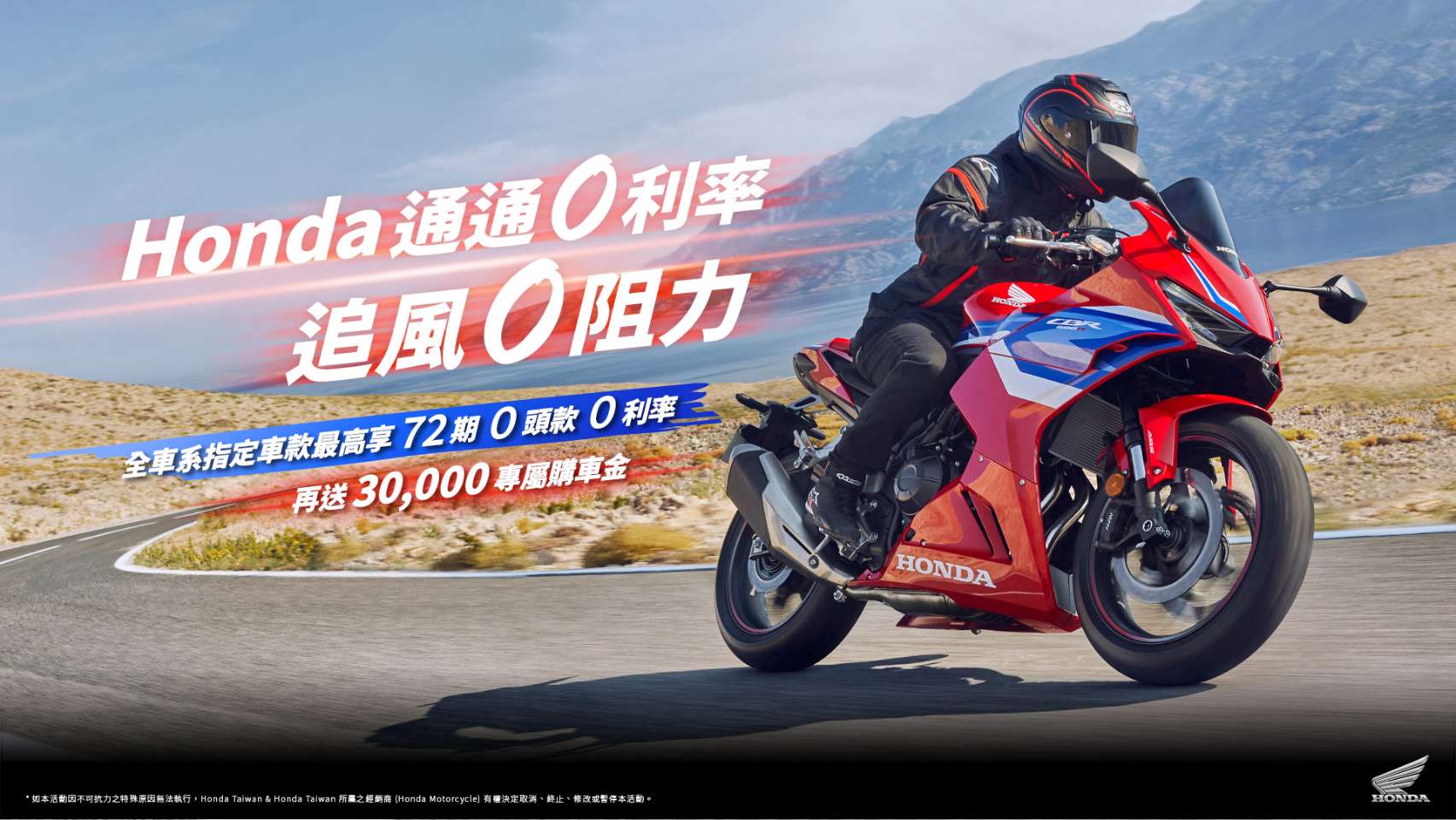 本月特別推出 「風格隨行 任性開騎」 專案,凡訂購最具個性的Rebel500、Rebel 1100,即可享有 30萬30期零利率,購車再送馬鞍包左右套組,完美融合率性風格與裝載便利性。針對全能冒險家XL750 Transalp 推出「遊你領航 最終季」方案,運動強化版(含水箱防護網、前防護桿、支架、引擎防護桿、引擎下護板、護弓支架、快速換檔套件 價值:60,202) 運動化的外觀與配備,熱血風格全面進化,售價:488,000 ; 騎旅機能版(含專屬側箱組、專用支架、鋁合金面板 價值:45,860)再享72期,零頭款、零利率之外,再送三萬元購車金,搭載科技新潮流的CB650R E-Clutch以及CBR650R E-Clutch,享30萬、30期 0利率優惠,限時再送Shoei Z-8安全帽,為所有騎士帶來前所未有的輕鬆駕馭體驗,再針對多款人氣機種提供超值的「通通零利率 追風零阻力」專案,全車系指定車款最高享72期、0頭款、0利率 再送3萬專屬購車金,不論是日常通勤、假日出遊或冒險壯遊,都能無壓力且無負擔入主Honda人氣二輪機種,享受專屬於騎士的馳騁自由。