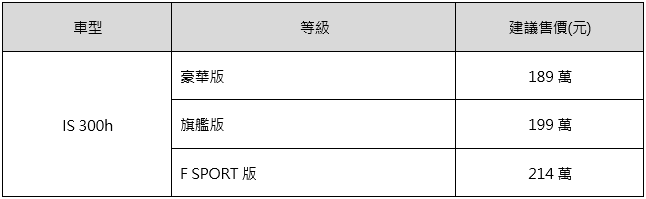 即日起IS 300h全新上市,在等級編成上提供豪華、旗艦及F SPORT共3個等級,售價自189萬元起。誠摯邀請您立即入主,親身蒞臨台北車展現場體驗IS魅惑跑格的風采,也歡迎造訪Lexus官方網站(http://www.lexus.com.tw)或致電顧客服務中心0800-036-036獲得更多IS車款相關資訊。