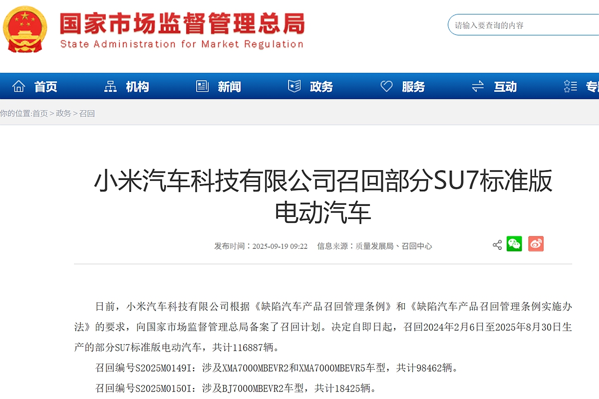 中國Xiaomi小米汽車決定召回2024年2月6日至2025年8月30日生產的部分SU7標準版電動車共116,887輛。其中包含XMA7000MBEVR2和XMA7000MBEVR5車型的98,462輛,以及BJ7000MBEVR2車型的18,425輛。