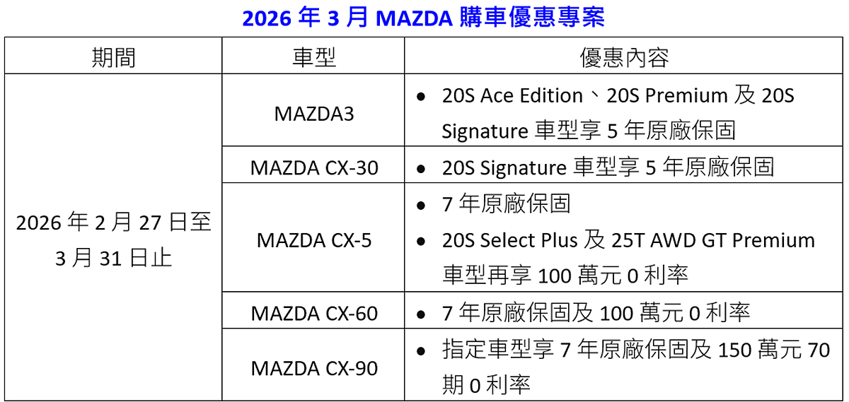 3 月入主 MAZDA 指定車型享 7 年原廠保固及 150 萬元 0 利率購車禮遇