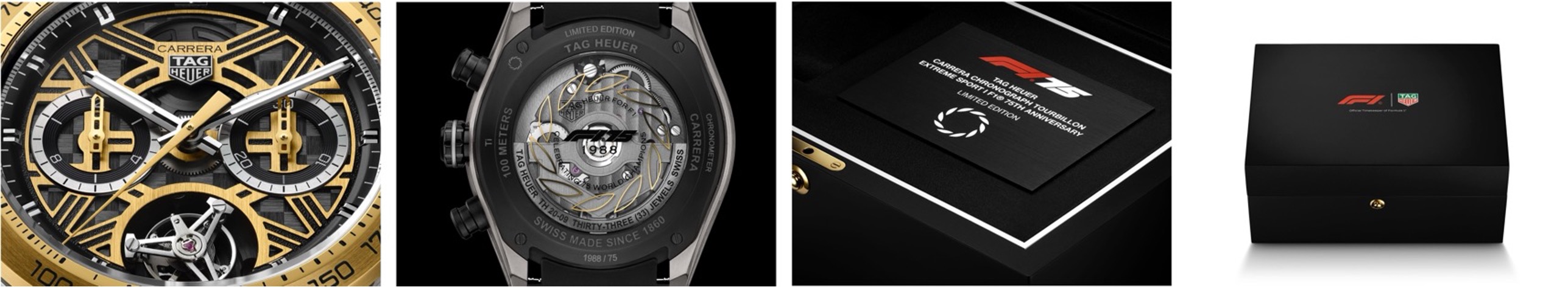 瑞士奢華製錶品牌 TAG Heuer 泰格豪雅隆重推出 Carrera Chronograph Tourbillon Extreme Sport 陀飛輪計時腕錶 | F1® 75週年黃金限量版,向一級方程式®賽車七十五年的輝煌歷史致敬。非凡新作不僅讚頌頂級賽車競技,更彰顯 Carrera 系列的傳世精神。全球限量 75 只,每只均有專屬獨立編號,完美體現品牌「逆勢而上、勝勢由我 - Designed To Win」的理念,將精湛技術與賽道榮光融為一體。