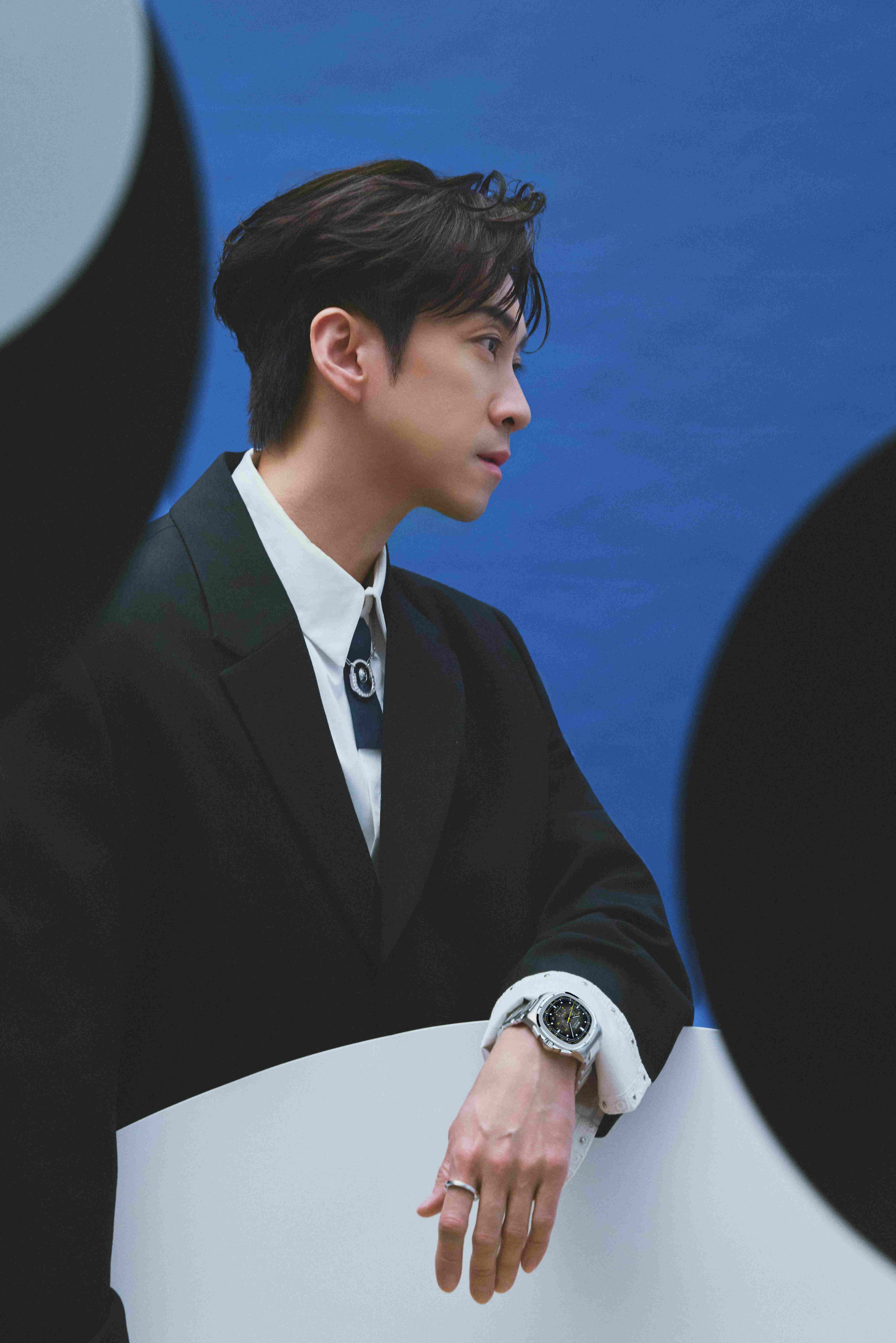 紅毯上,陳漢典以秋冬系列深灰色西裝亮相,MIDO腕表灰黑漸層錶盤展現深邃層次,亮黃色指針也回應了今年金鐘 60 螢光黃的主色調,在細節中低調展現對典禮主題的用心。看似規矩的正裝則蘊藏設計亮點,褲裝採一邊百褶一邊筆直的不對稱剪裁,沉穩氣勢中帶點玩心,正好符合他內斂又帶幽默的特質;內搭鉚釘刺繡的白襯衫,俐落剪裁中隱藏精緻心思,身上的珠寶配飾象徵愛的無限可能與恆久守護,而手上的 MIDO 腕錶則以時間見證他此刻的幸福。在別具意義的金鐘盛典上,陳漢典以造型含蓄地展現愛意,是最浪漫的宣告,可見他此刻甜蜜的狀態,整體巧妙的搭配,使他更添魅力。