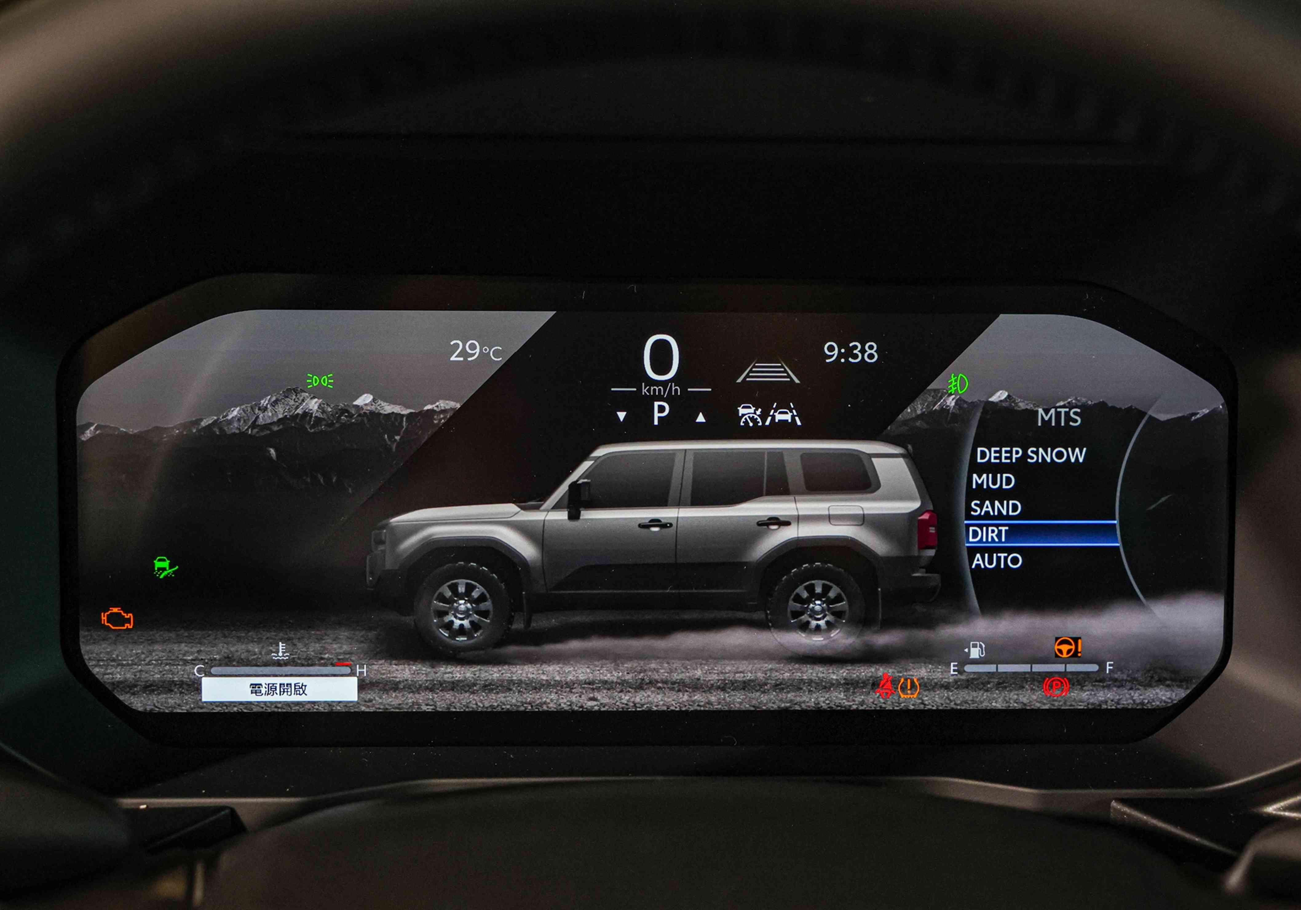 在座艙設計上,LAND CRUISER採水平設計語彙,提供開闊駕駛視野,並依實際操作情境配置大量實體按鍵,兼顧便利與直覺操作性。配備12.3吋數位儀表、中控螢幕與抬頭顯示器,支援無線Apple CarPlay與Android Auto,越野操作更輕鬆就手。同時升級多項豪華配備,如一鍵式開啟全景天窗、14支JBL環繞音響系統及前後皮質通風加熱座椅等。在安全防護科技上,搭載最新Toyota Safety Sense 3.0主動安全系統、8具SRS氣囊及E-Mirror電子後視鏡(註1),全方位守護乘員安全。