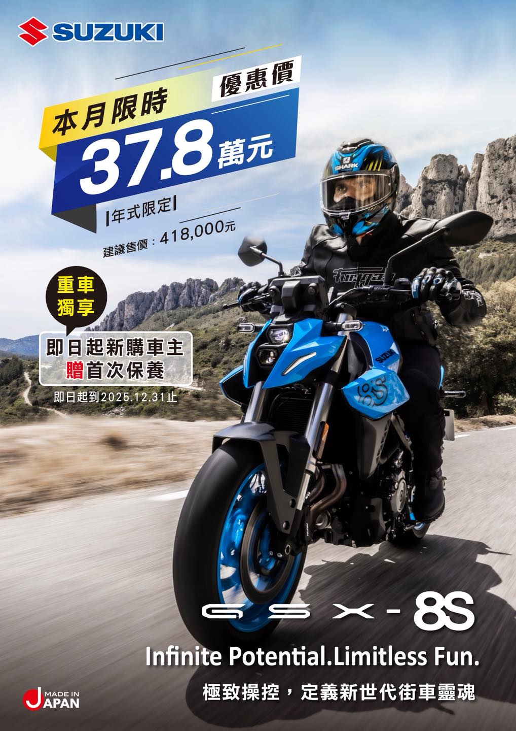 不論你是初次入門還是資深騎士,GSX-8S 以動力、科技與設計三位一體的實力,絕對值得親身體驗。
