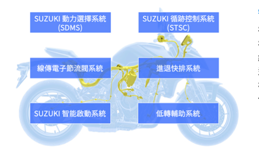 GSX-8S 標配 S.I.R.S(Suzuki Intelligent Ride System)智慧騎乘系統,整合多項進階電控功能,包括: