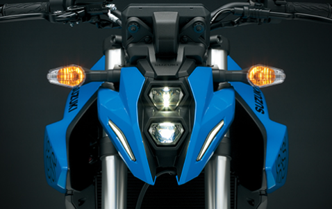 GSX-8S 採用 垂直堆疊式六角形 LED 頭燈組,搭配緊湊車頭線條,展現蓄勢待發的戰鬥姿態。