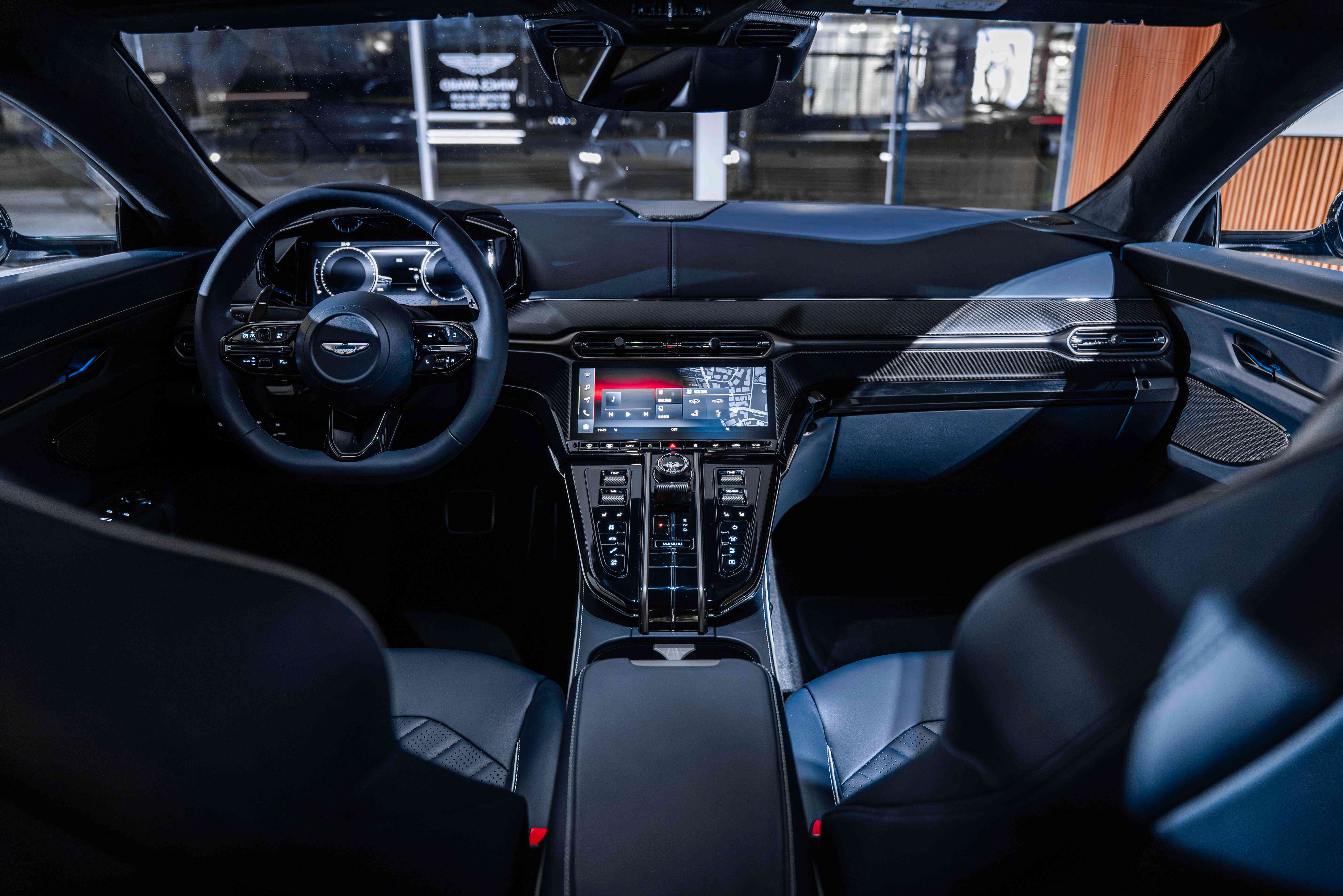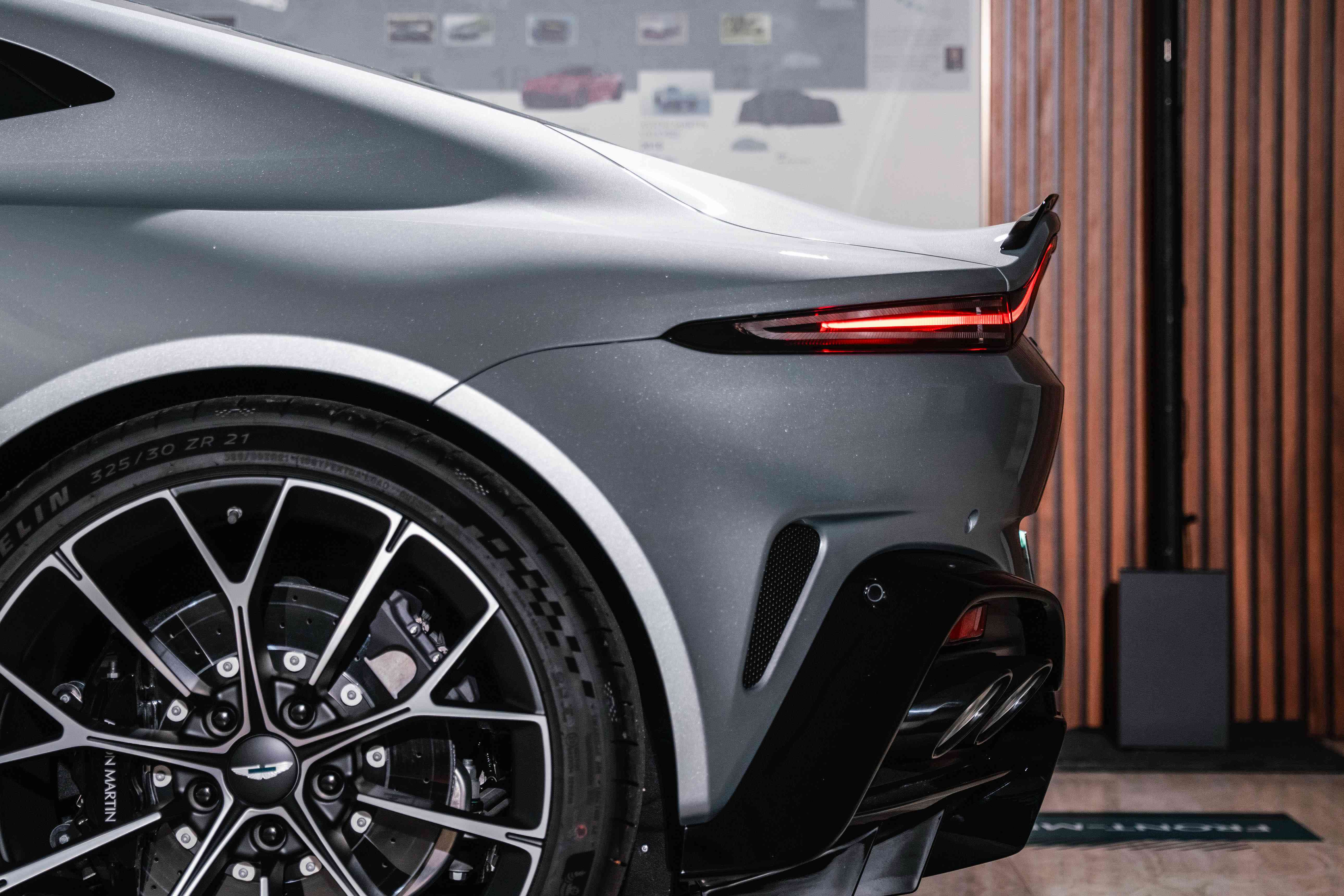 本次 Vantage S 展示車選配 Inspire Sport 匠心真皮運動內裝,以頂級全真皮包覆,採 Dark Knight 色調呈現。人字飾紋結合細緻打孔工藝,勾勒出鮮明的速度意象,營造極具張力的駕駛氛圍。外觀則搭配 Q by Aston Martin 特製 Titanium Silver 鈦銀色車色,為品牌新加入的專屬色彩,在不同光線下展現銀粉光澤與隱約的藍色底蘊,層次豐富且極具辨識度,並與 Vantage S 標配的亮黑色上層外觀套件相互輝映,完整詮釋其性能與質感兼具的設計理念。