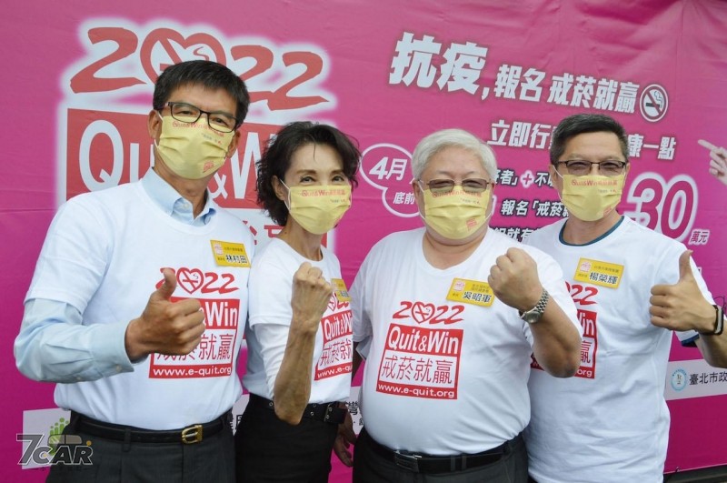 左起台灣大車隊集團董事長林村田、董氏基金會終身義工陳淑麗、衛生福利部國民健康署署長吳昭軍、台灣大車隊集團總經理楊榮輝,今(19日)以行動響應「2022戒菸就贏比賽」。