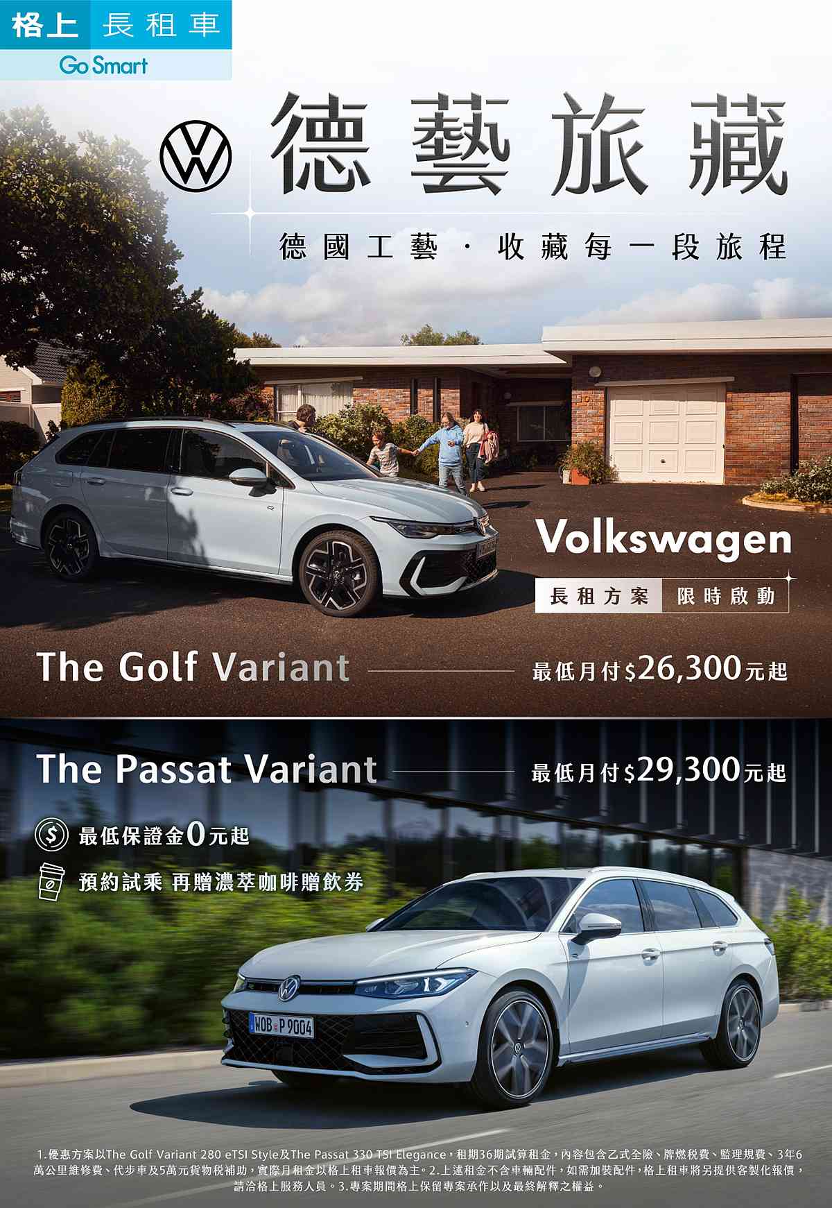 Volkswagen深耕台灣租賃車市場,投入囊括不同級距和種類的多樣車款,服務範圍涵蓋日租、共享、訂閱以及長租型態,提供彈性用車選擇,現正攜手格上租車,針對企業與個人客戶限時推出「德藝旅藏」長租專案*,於5月31日前申辦旅行車款The Golf Variant或The Passat,即能享有三重禮遇。