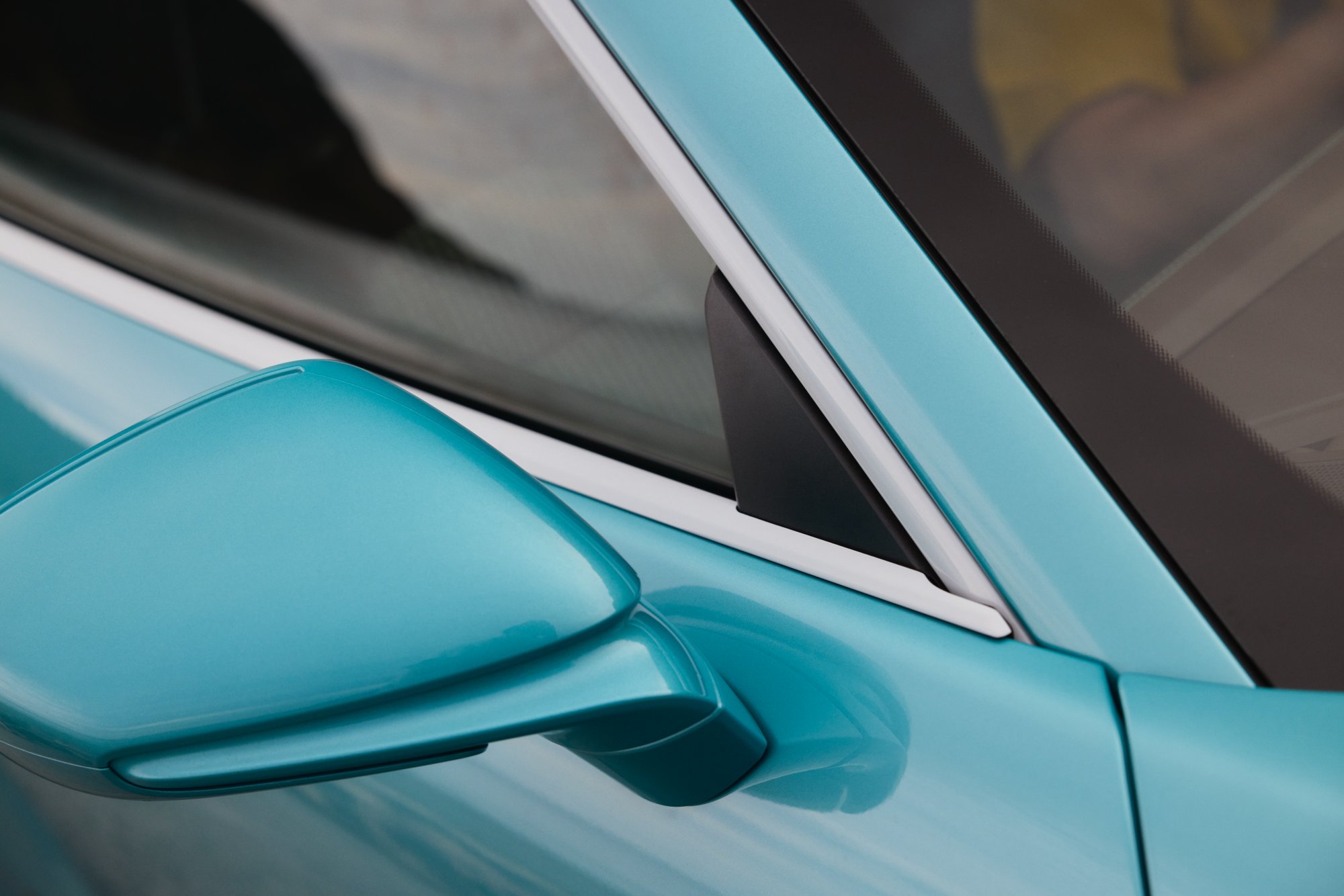 911 Carrera T「Formosa」的外觀採用保時捷嚴選選色(Paint to Sample)的金屬伊帕內瑪藍色( Ipanema Blue Metallic ) ,此色調象徵著環繞台灣的浩瀚海洋。此主色與金屬鈴鹿賽道灰色( Suzuka Grey Metallic)形成鮮明對比 ,代表著台灣東海岸崎嶇的岩石地貌,並巧妙應用於車尾的「PORSCHE」字樣 、側窗飾條 及後引擎蓋格柵的鑲嵌上 。20/21 吋 RS Spyder 輪圈以 Suzuka Grey Metallic 金屬漆塗裝 ,內圈輪輻則採用金屬釩灰色(Vanadium Grey Metallic ) ,共同營造出精緻的工藝美感。此外,搭配 Exclusive Manufaktur 選配的燻黑高解析度 HD 矩陣式 LED 頭燈系統 及 Exclusive Design 專屬設計尾燈 ,更進一步強化整車的頂級質感。