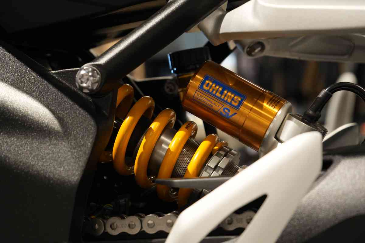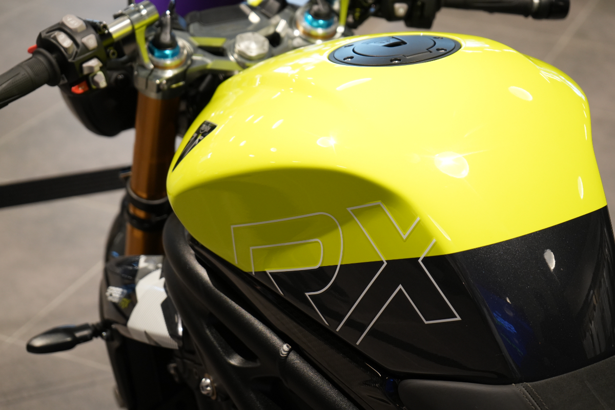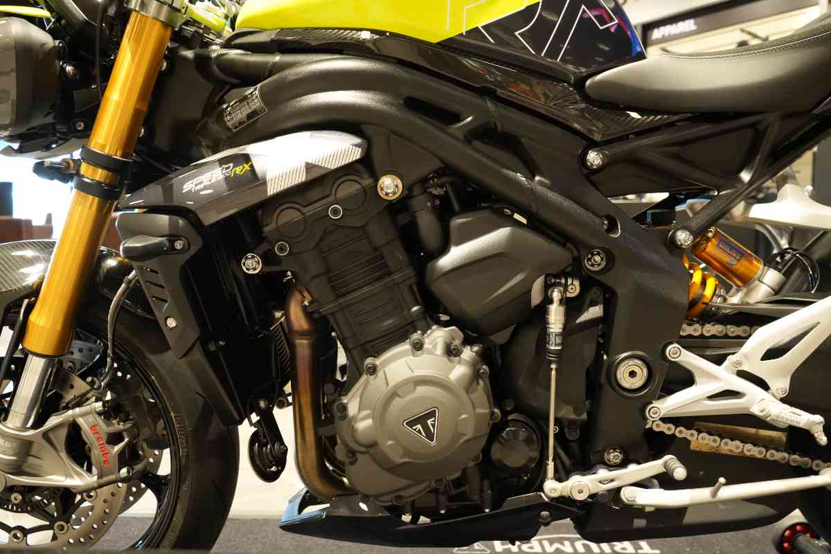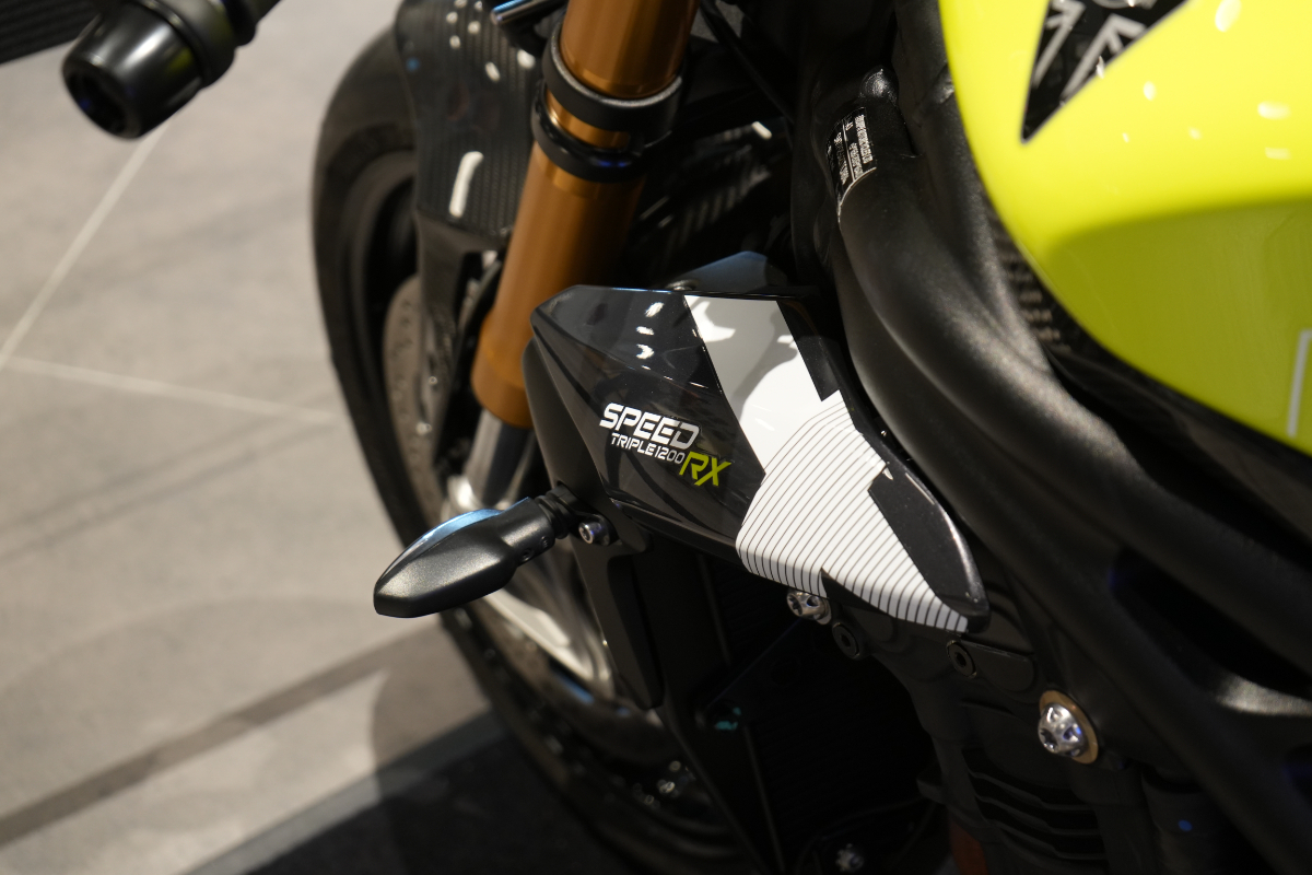 Triumph Triple 1200 RX在塗裝上只提供單一黃黑混搭配色,同時該色系也是品牌的經典風格,在外觀上還加入碳纖維增添賽道風格,包含前擋泥板、油箱下方飾條、排氣管護照等。硬體配備上,它採用Öhlins Smart EC3電子懸吊系統,具有OBTi技術,也就是可以根據騎乘模式,自動調整懸吊阻尼,且身為限量的RX車型,還能自動根據駕駛速度與地形,調整阻尼強度。