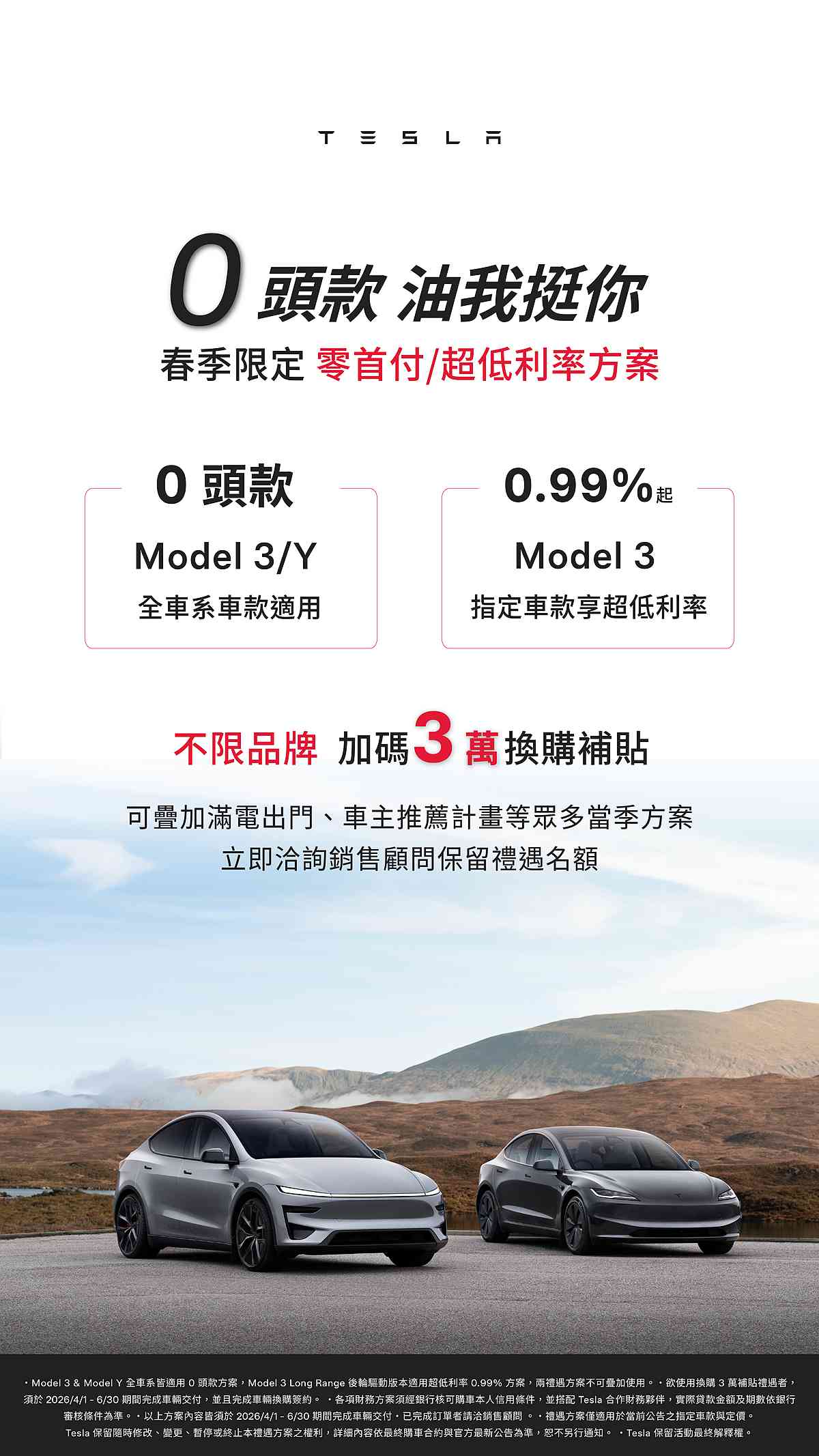 • Model 3 指定車款享 0.99% 超低月付利率方案