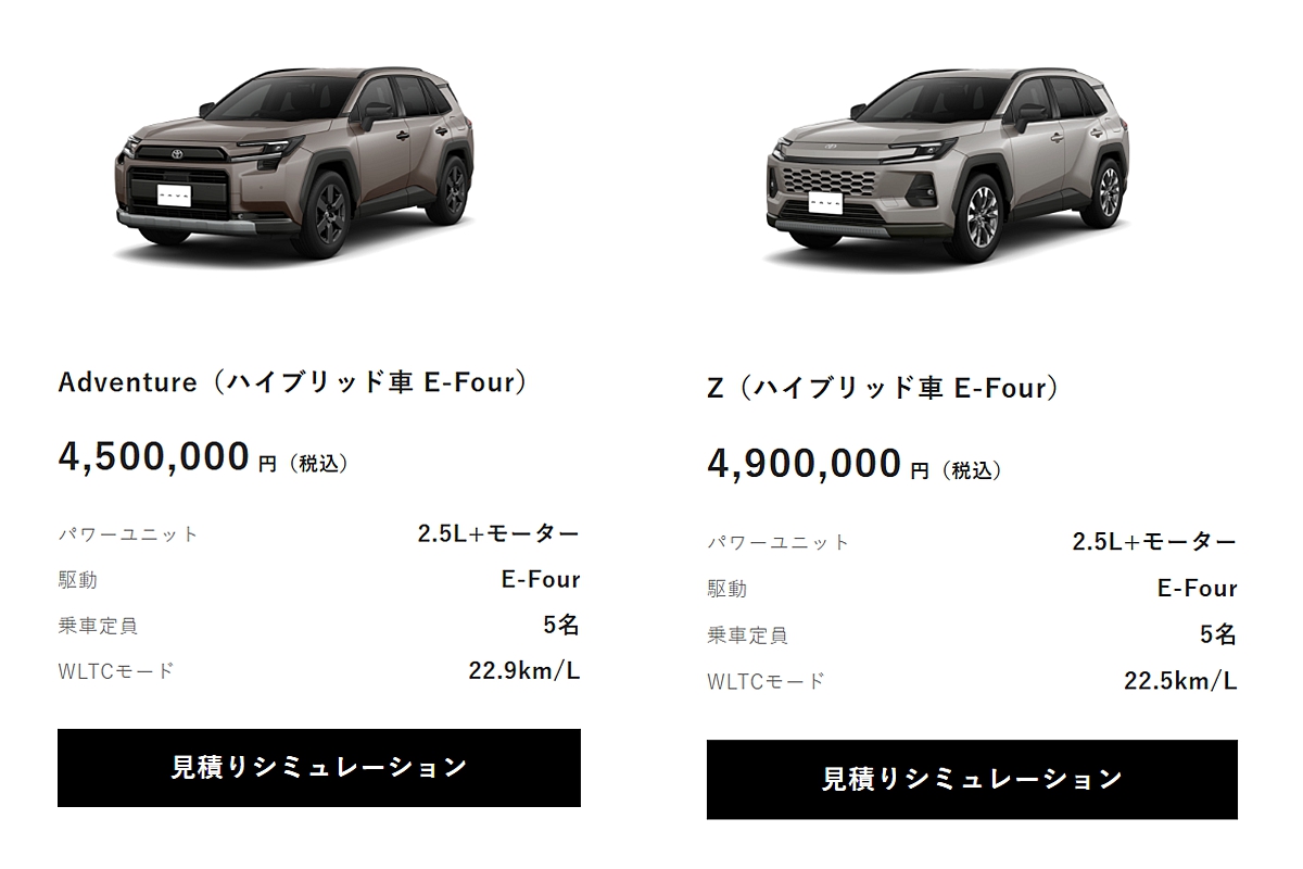 全新第六代Toyota RAV4於日本先提供Z、Adventure以及兩種外觀風格設計並採單一銷售車型,且全數都標配E-Four電子四輪驅動系統。