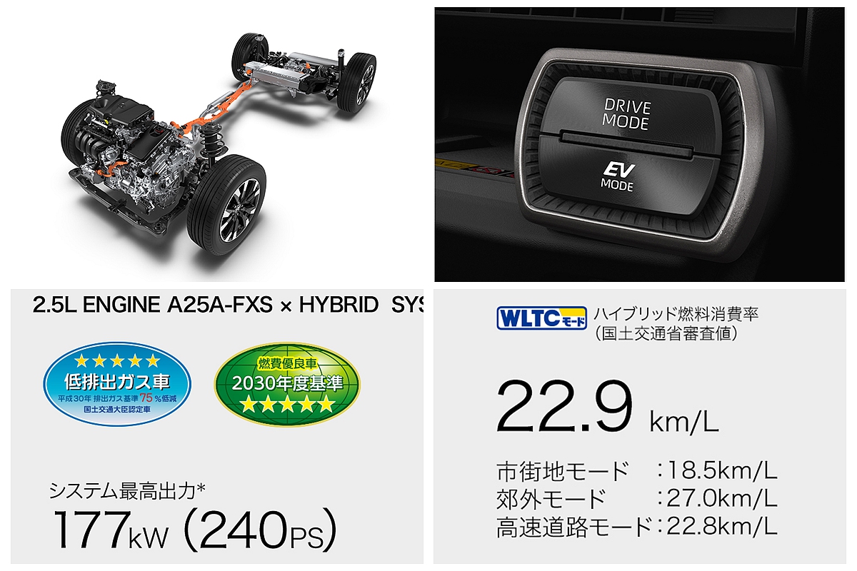 日規全新第六代Toyota RAV4 HEV搭載2.5L Hybrid複合動力系統,汽油引擎來自代號A25A-FXS,搭配前、後各一的交流同步馬達,可輸出240ps綜效馬力表現。不僅能提供純電EV行駛模式可以使用,平均最佳油耗更可達22.9km/L。