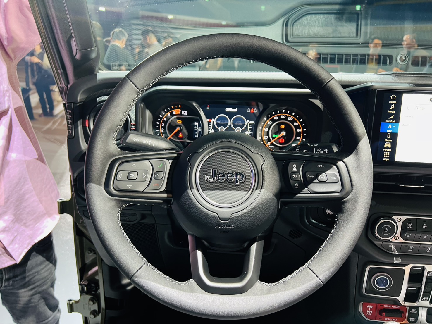 中控儀錶採用 7 吋全彩 TFT 液晶顯示面板,整合行車資訊、越野即時數據及多媒體狀態顯示,可自訂顯示內容,直覺呈現車輛動態、驅動模式與系統狀態,精準掌握關鍵資訊,維持最佳控制與行車安全。而 Rubicon 以及 Sahara 車型皆內建越野資訊顯示介面 (Off-Road Pages) ,可即時呈現坡度角、車體傾斜、轉向角度、冷卻溫度、輪胎壓力等關鍵數據,協助駕駛在複雜地形中做出更精準判斷。