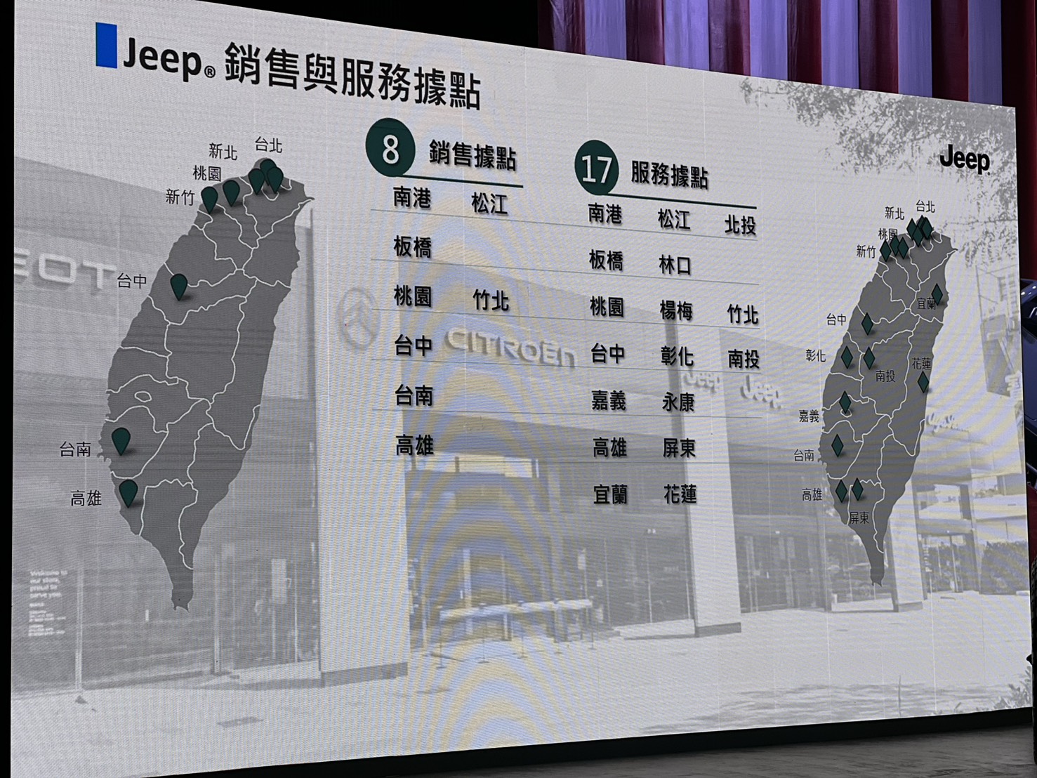 隨著 Jeep® 正式重返台灣市場,Jeep® 總代理 寶嘉聯合同步啟動全台網絡布局。未來 Jeep® 將以 8 個依循 Jeep® 全球標準規範打造的新車展示中心,與 17 個授權服務廠為核心,打造橫跨北中南的完整銷售與售後網絡,讓每一位 Jeep® 車主無論身在何處,都能享有一致且值得信賴的服務體驗。
