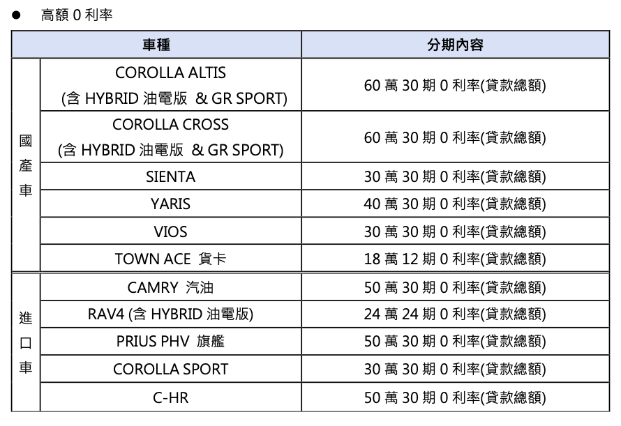 註3:「高額0利率」活動限制為:各指定車款0利率優惠方案不同。經銷商及指定貸款企業保有審核之權利,且不得與其他貸款優惠專案併用。零利率購車優惠方案之分期付款與現金付款之建議零售價相同,但實際交易價格、最高貸款總額與期數由買賣雙方各自依交易條件內容協商議定之。