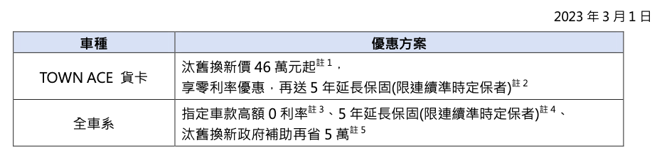 註2:本活動之適用對象為2023/3/1~3/31購買TOWN ACE貨卡,貸款總額上限18萬,期數上限12個月。經銷商及指定貸款企業保有審核之權利,且不得與其他貸款優惠專案併用。零利率購車優惠方案之分期付款與現金付款之建議零售價相同,但實際交易價格、最高貸款總額與期數由買賣雙方各自依交易條件內容協商議定之。本活動不適用於租賃、政府機關及專案批/標購者。以上詳細活動辦法與限制請參閱TOYOTA官網(https://www.toyota.com.tw/)。5年延長保固係指「準時定保送5年14萬公里全車延保」,其活動限制為:2019/1/1起新交車車主(限自用&租賃,不含營業車),自交車日起算至5年或14萬公里(已先到者為準)前,連續每6個月內均回TOYOTA經銷商服務廠實施定保套餐之車主(排除營業車),可免費再享第5年或14萬公里(已先到者為準)全車延長保證「經濟版」,保證項目同新車保證(台灣本地加裝之用品及配件除外)。