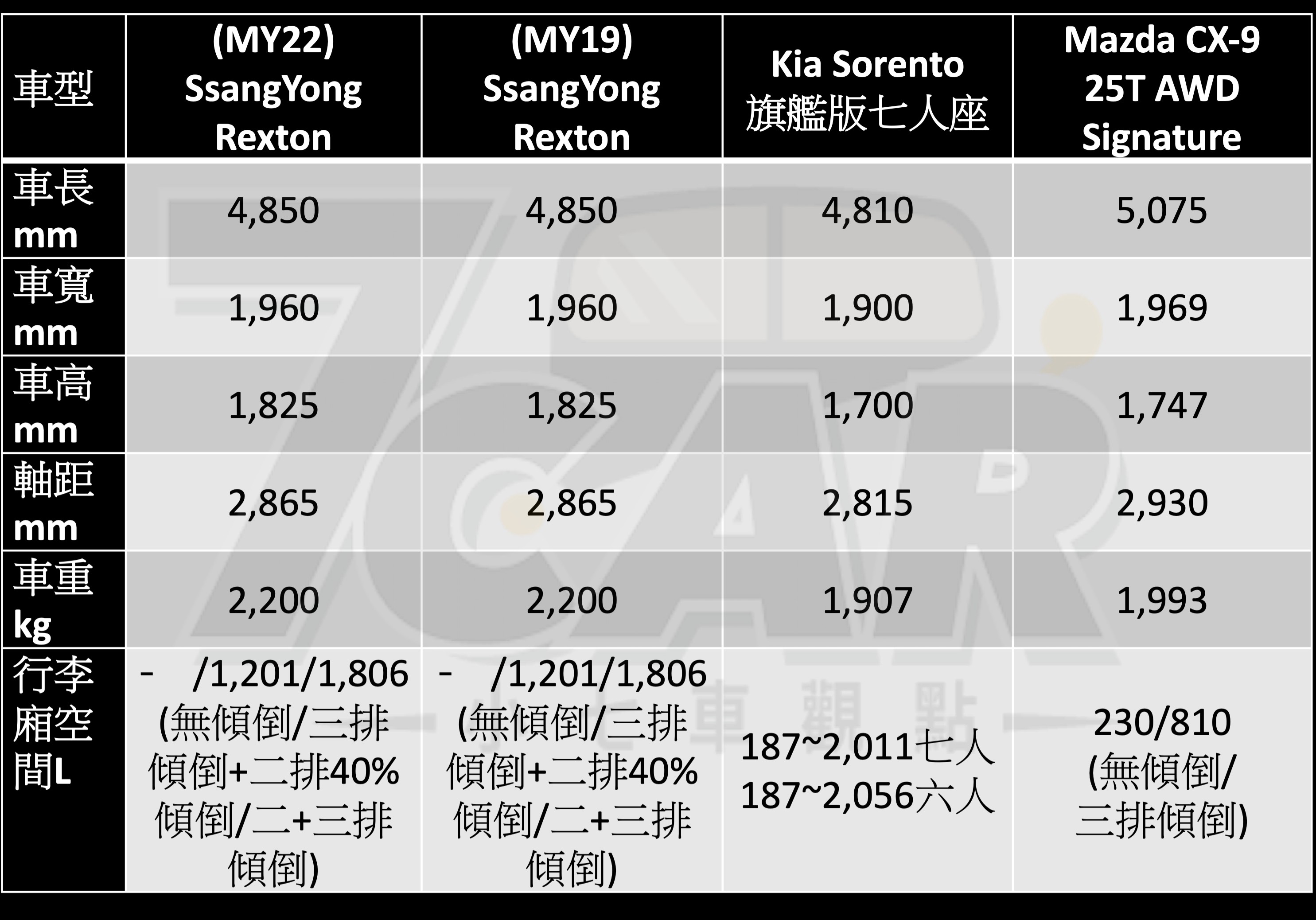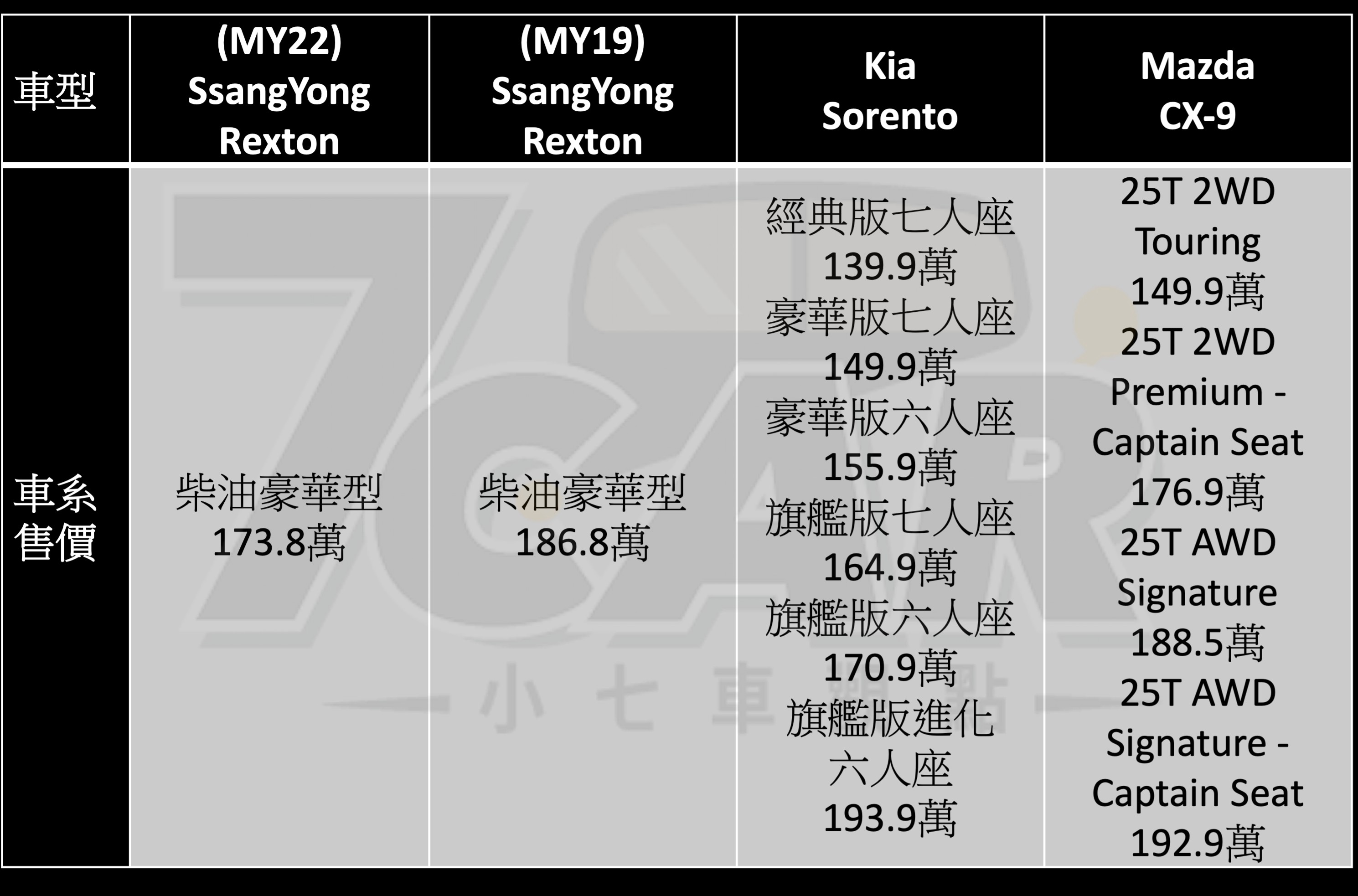 歐系對手方面包含 Tiguan Allspace、Kodiaq、5008,日系選項則是 CX-9、Land Cruiser Prado,同樣來自韓國的代表也有 Santa Fe 及 Sorento,而到了這樣的價格帶,自然多數都是進口身份(國產 URX 亦為相同設定),Rexton 的開價若暫不考慮車款綜合實力,與其它主要對手相較算是位處中間地帶。