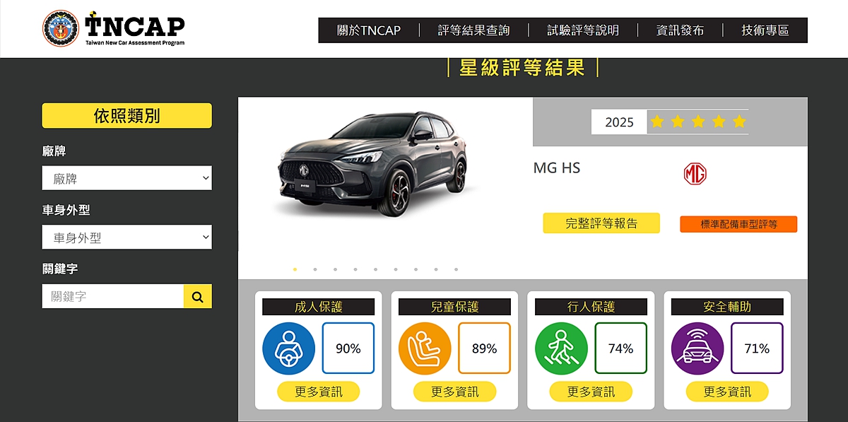 從測試結果來看,MG HS在成人防護項目中以90%高分,明顯高於取得星等所需的80%門檻;兒童保護同樣繳出89%的優異成績,就連向來是多數車款較難拉高分數的 安全輔助系統,也拿下71%。值得注意的是,TNCAP的星等評鑑並非單看總平均分數,而是採取「四大項目全面檢視」的方式,只要其中任一項目星等偏低,整體最終評等便會受到限制,甚至可能直接影響五星資格。