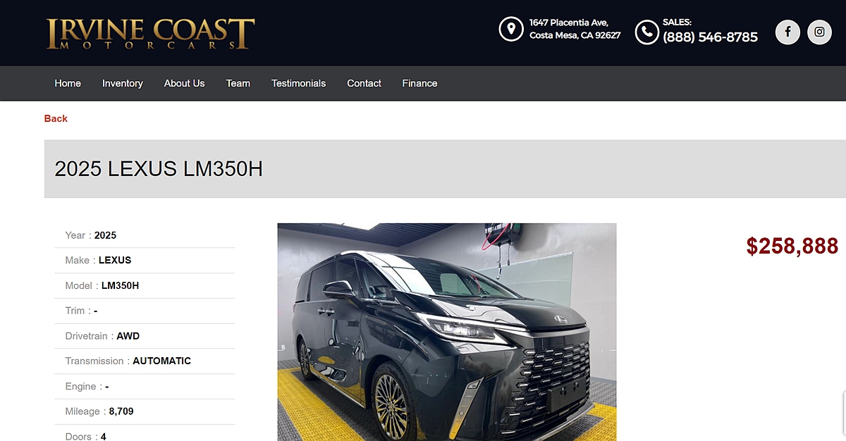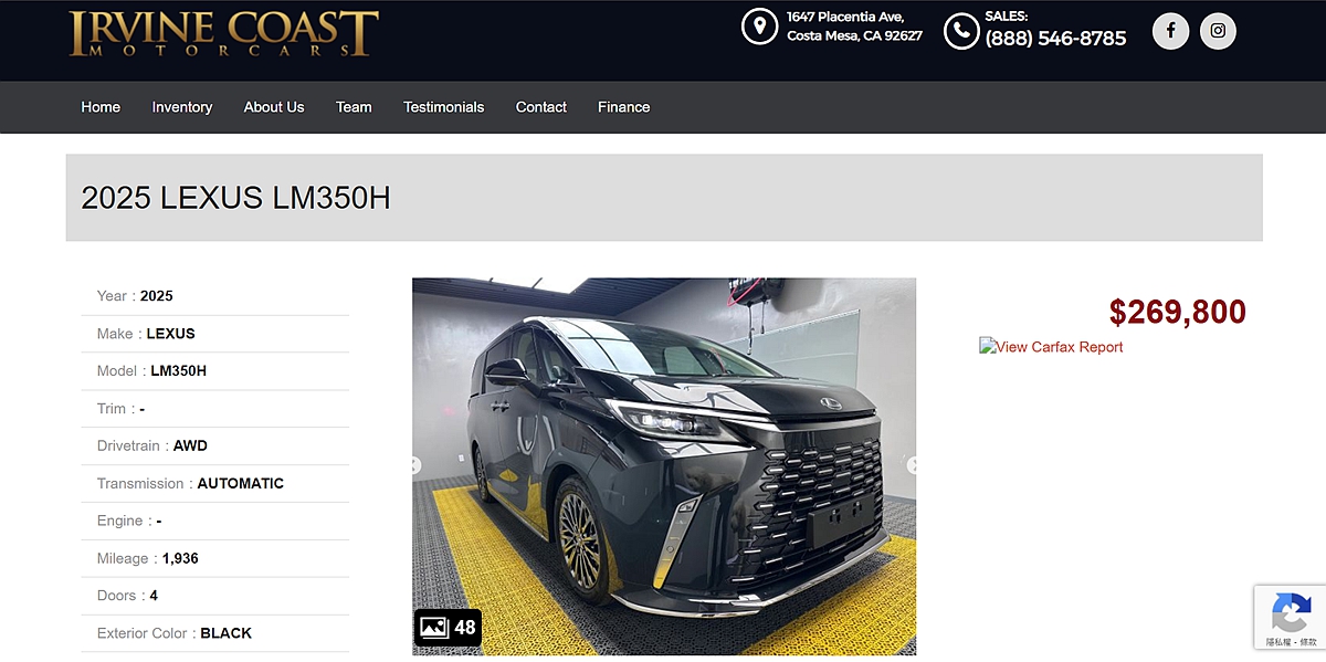 外媒《Motor1.com》報導他們赫然在加州發現了Lexus LM豪華MPV,循線追查後發現是當地一家中古車商《Irvine Coast Motorcars》引進銷售。雖然不明白是怎樣能夠在美國當地領牌,但確實已經刊登在網路上尋找買家。