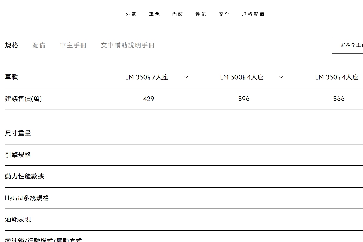 至於Lexus LM在台灣市場提供豐富的LM 350h七人座、LM 350h四人座、LM 500h六人座以及LM 500h四人座等豐富車型,起售價格為LM 350h七人座的新台幣429萬,最貴車型則是LM 500h四人座車型則開價新台幣596萬。