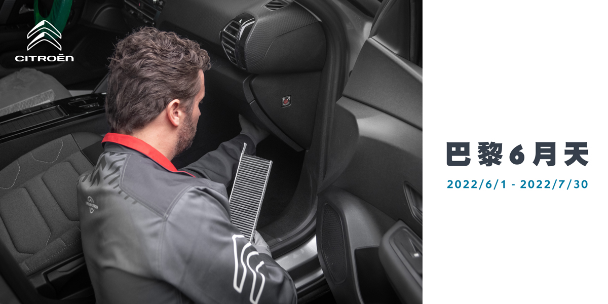 2022 CITROËN巴黎6月天冷氣健診服務活動自即日起至2022年7月31日止,為車主提供夏季免費健診服務及專屬零件優惠,活動期間內單筆消費發票金額滿NT$8,888元還可獲得法系經典車車野餐墊乙份。另外,服務活動出廠後,也歡迎踴躍分享本次巴黎6月天冷氣健診服務活動的返廠體驗,成功上傳問卷即有機會獲得CITROËN迷你模型車乙輛。為節省您的寶貴時間,歡迎多加利用全台授權服務廠預約專線,事先安排服務時間,活動詳情請參閱官方網站www.citroen.com.tw及CITROËN全台經銷商授權服務廠。
