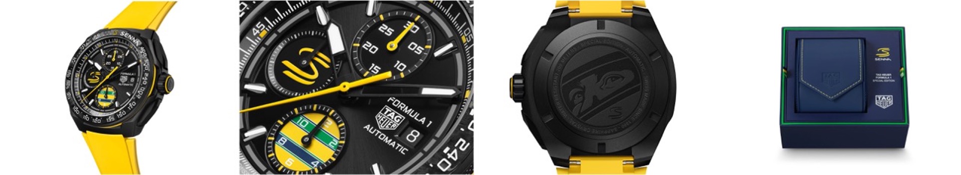 TAG Heuer Formula 1 x Senna 特別版計時腕錶44毫米款以自動機芯驅動,設計靈感源自洗拿的賽車頭盔與巴西血統:黑色太陽放射紋磨砂錶盤以鮮明色彩點綴,6 點鐘位置設有融合巴西國旗配色的小錶盤,12 點鐘位置 30 分鐘計時盤搭配亮黃色漆面指針,9 點鐘位置小秒盤飾以黃色「S」標誌,而中央計時秒針則同樣採用鮮豔黃色漆面,以精準而有力的節奏劃過錶盤。全新時標取材自 F1 賽車流線線條,搭配鏤空黑漆時針與分針,進一步提升易讀性與整體風格。
