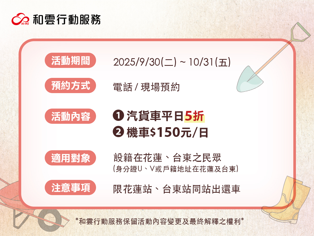 自2025年9月30日至10月31日止,凡身分證開頭為U或V,或戶籍地址位於花蓮、台東的民眾,於和運租車花蓮、台東門市出示身分證,即可使用優惠方案,汽車及貨車平日租金5折、假日8折,機車則不分平假日,每日僅需150元,長天期租用另有優惠,相關方案詳情及預約,可致電和運門市或臨櫃辦理。
