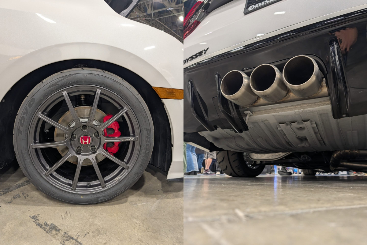 在SEMA改裝車展中引起車迷注意的,便是由Bisimoto和Jordan Distributors聯手打造的Odyssey,外觀上並沒有非常乖張,大多數都維持原廠,僅僅採用亮黑色的前下巴、側裙與後下擾流等,不過後方的排氣管便帶出濃郁的FK8氣質,採用中置三出排氣管,車標當然也改為Type R專屬的紅色Logo,右下方再貼上Type R字樣。
