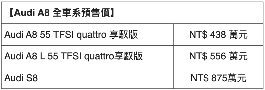 - 台灣奧迪引進完整車系陣容,提供A8 55 TFSI quattro享馭版、長軸A8 L 55 TFSI quattro享馭版及性能旗艦S8 三款車型,預售價自438萬元起。