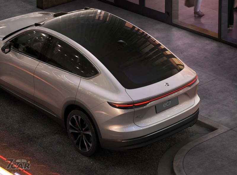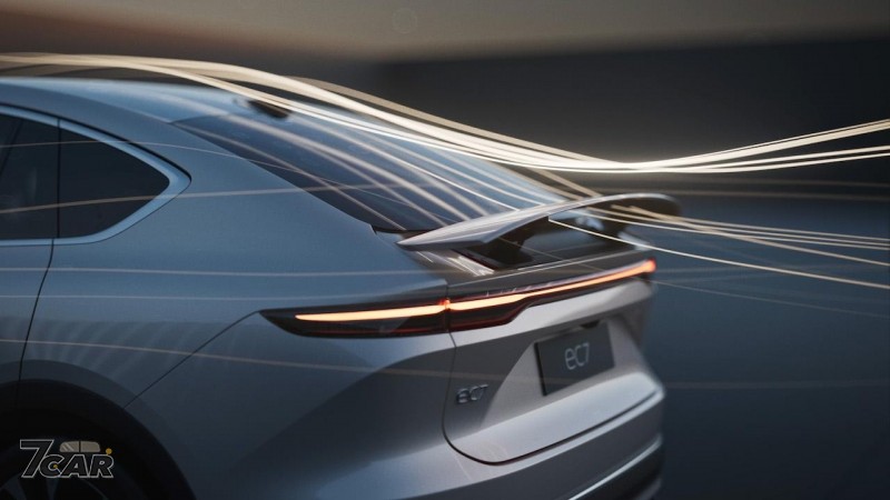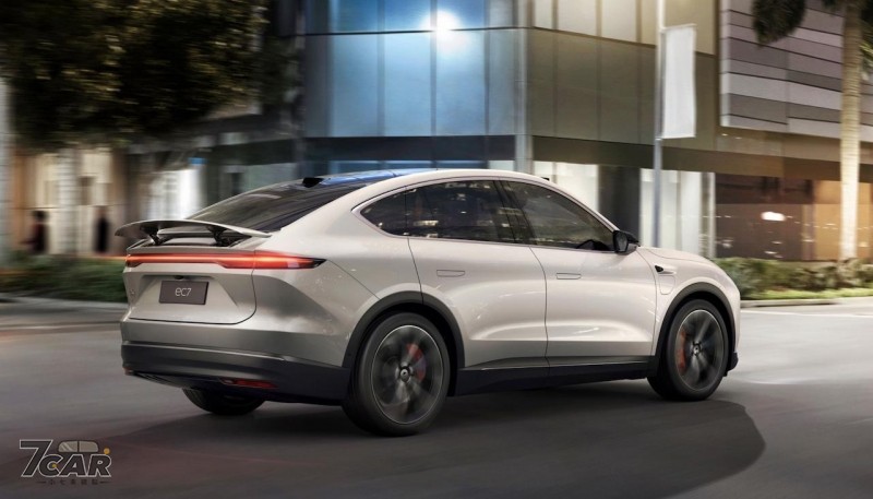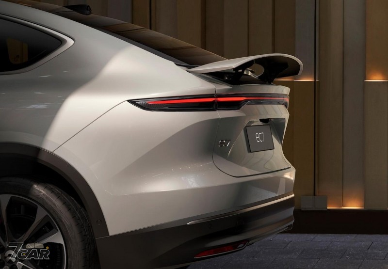 EC7 的車身尺碼長寬高分別是 4,968 x 1,974 x 1,714 (mm),軸距則為 2,960mm,在外觀部分承襲家族化的設計語彙,包括分離式頭燈、貫穿式尾燈、隱藏式門把等,在車尾配置該廠首見的主動升降式尾翼,支援 2 種運作模式,也使此車風阻係數最低可達 0.23Cd。