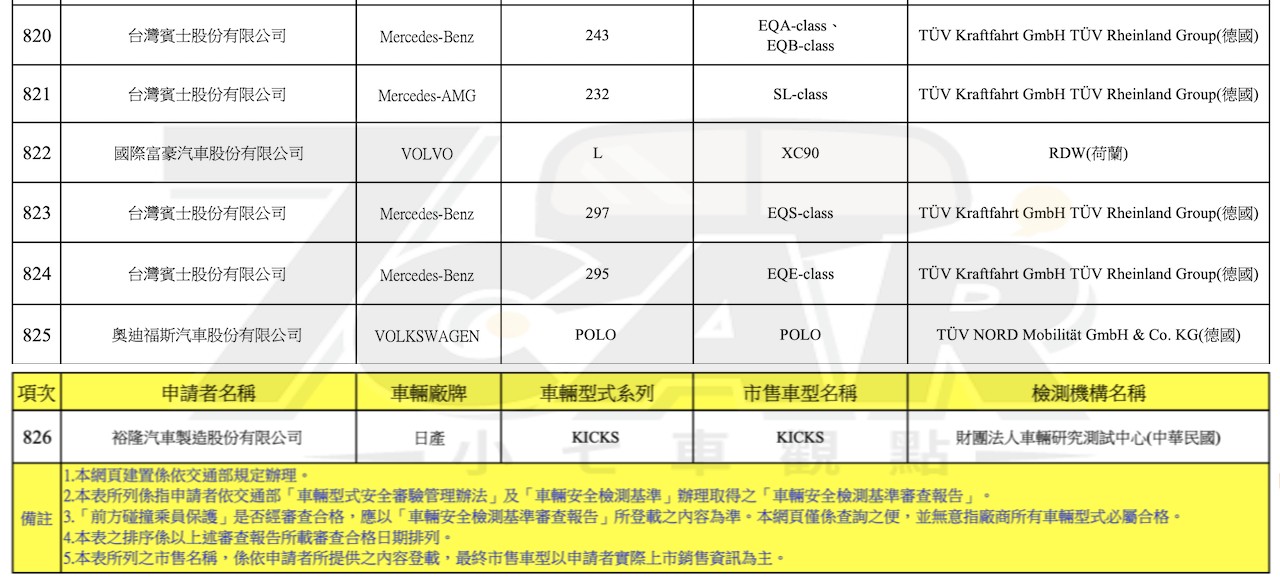 車輛安全資訊網日前公布 5 月份碰撞乘員保護合格車款名單,包括前方碰撞乘員保護及側方碰撞乘員保護兩大項目,其中在國產車部分可以見到裕隆日產汽車將在今年下半年推出的小改款 Nissan Kicks 獲得合格的表現,其檢測機構為 ARTC 財團法人車輛測試研究中心。