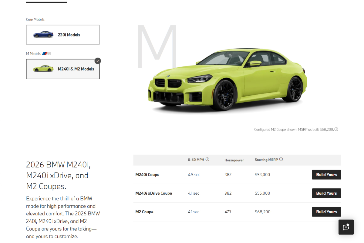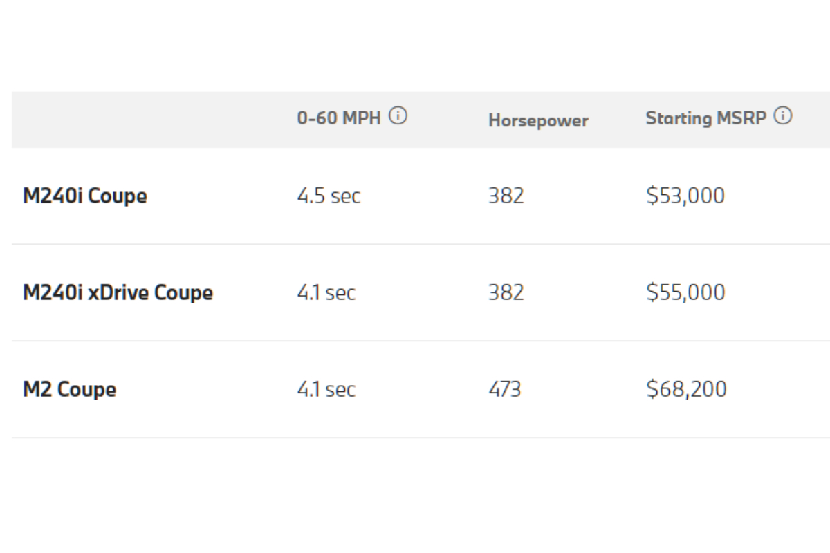 而照片顯示Prelude的建議售價為43,850美元,加上「市場調整」後的售價為68,850美元,約新台幣216.7萬元,這價錢還不包含稅費、牌照稅與其他雜費。在此定價之下,你能獲得0 km/h至100 km/h加速約9秒的懷舊小跑車,還是選擇花費更少的68,200美元,購買0 km/h至100 km/h加速只要4.1秒的M2?