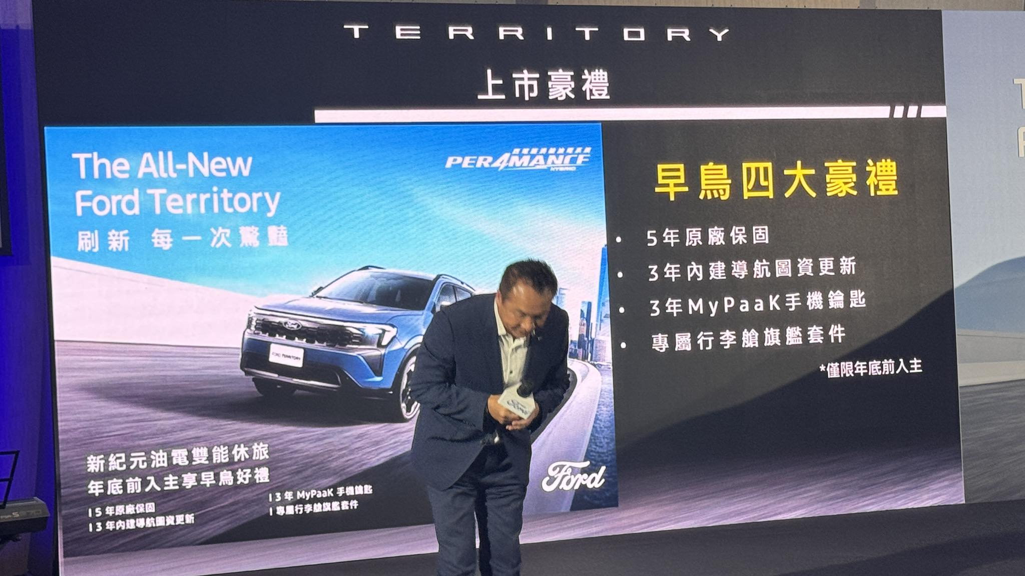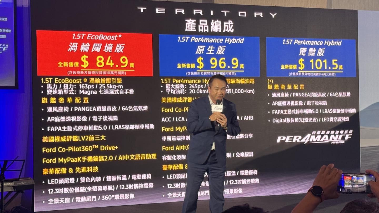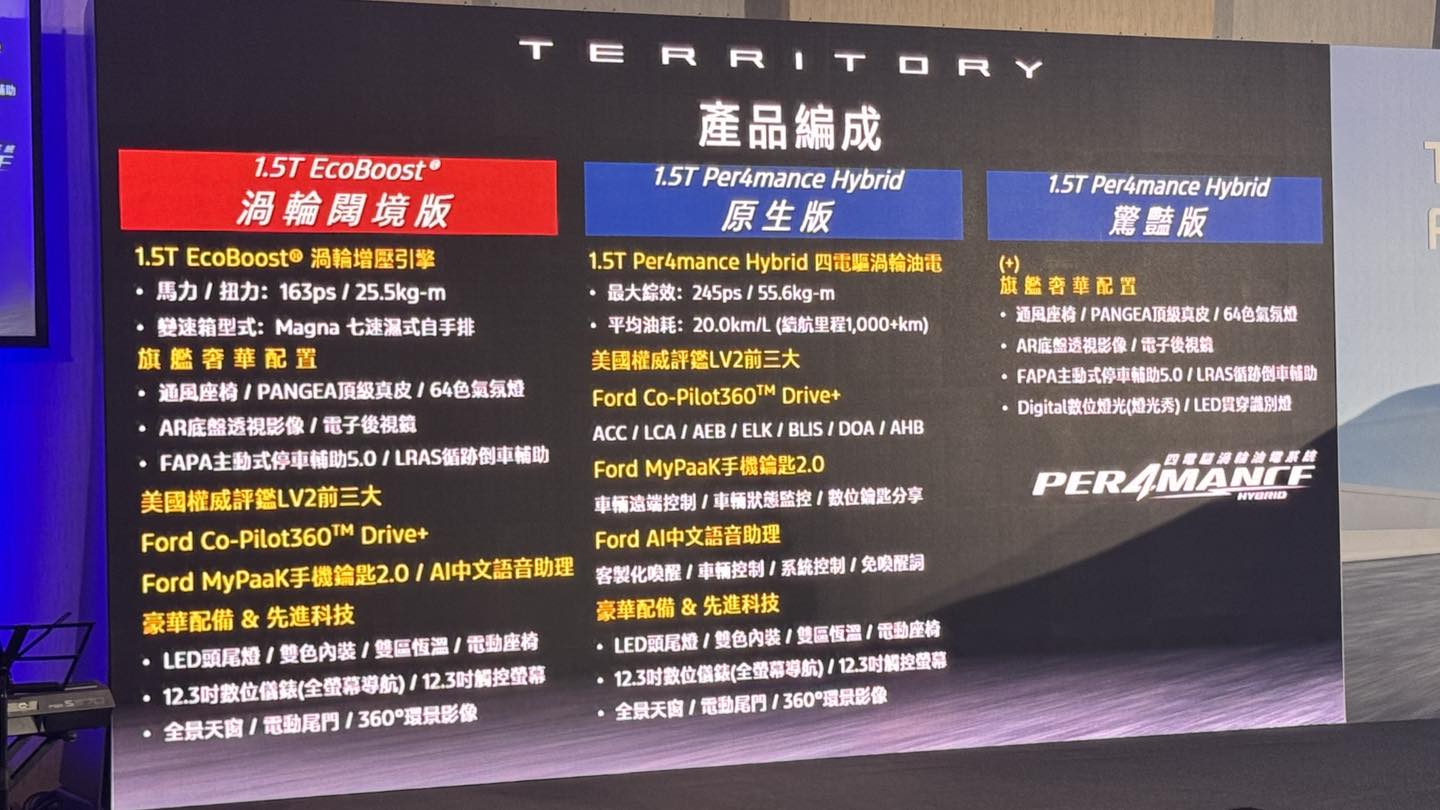 All New Ford Territory正式公布售價!除了1.5T Per4mance Hybrid 油電旗艦車型,當時預售價為 109.9 萬元,如今正式售價自 94.9 萬元起。本次提供 1.5T Per4mance Hybrid 四電驅渦輪油電與 1.5T 汽油渦輪雙動力、共三款車型選擇。福特同步推出價值超過 8 萬元的「四大早鳥好禮」,包含 5 年原廠保固、3 年內建導航圖資更新、3 年 MyPaaK 手機鑰匙 2.0 服務,以及專屬行李艙旗艦套件。